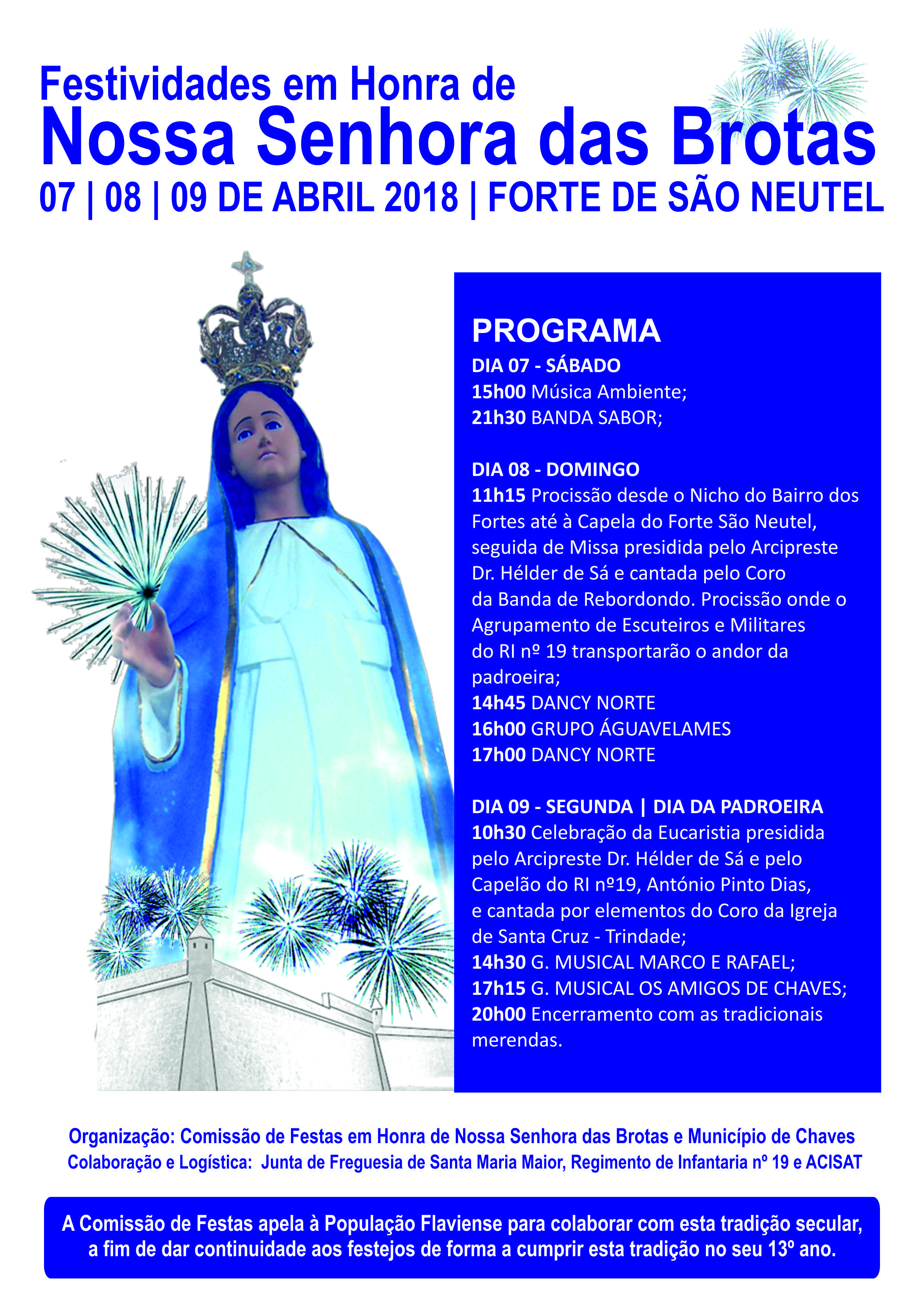 Município de Chaves e Comissão de Festas em Honra de Nossa Senhora das Brotas. Apoio: Junta de Freguesia de Santa Maria Maior, Regimento de Infantaria nº 19 e ACISAT