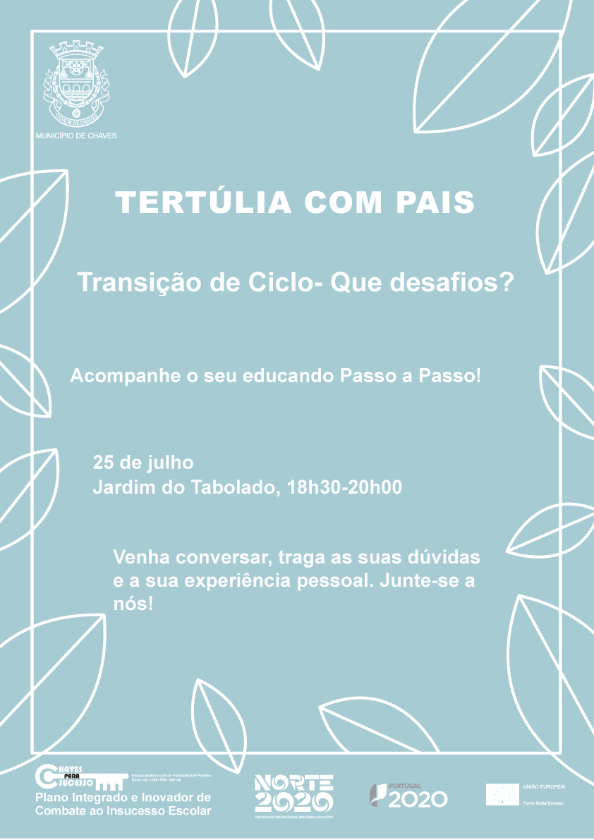 A autarquia vai promover uma tertúlia com os pais/encarregados de educação para reflexão sobre as dificuldades encontradas aquando da transição de ciclo, ao longo do percurso escolar. O encontro terá lugar no dia 25 de julho, das 18h30 às 20h00 horas, no Jardim do Tabolado, e será dinamizado por uma psicóloga e uma animadora sócio cultural da Equipa Muldisciplinar/Parentalidade Positiva, no âmbito do Plano Integrado e Inovador de Combate ao Insucesso Escolar do Município de Chaves.