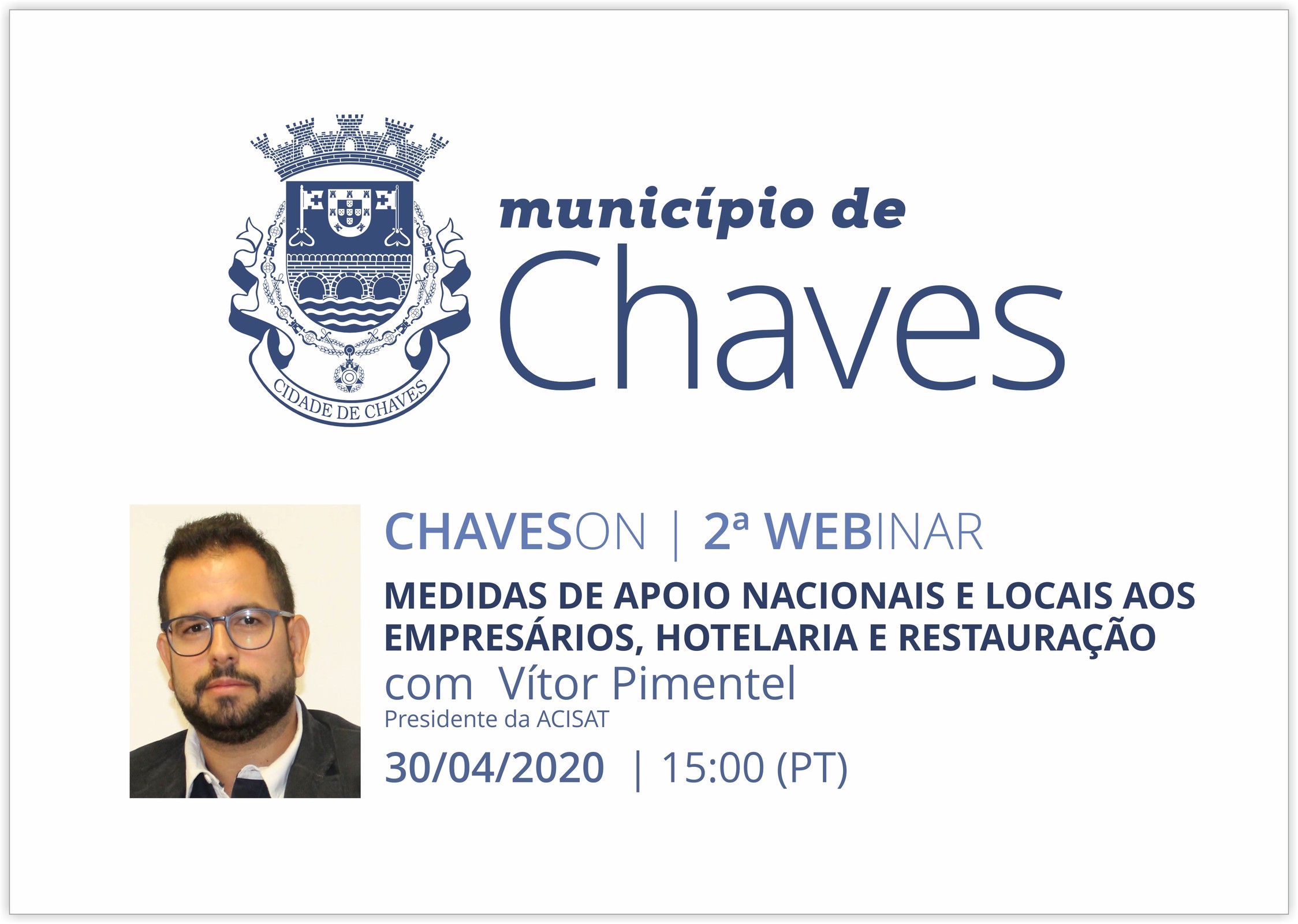 Nesta segunda sessão irão ser abordadas as Medidas de apoio nacionais e locais aos empresários, hotelaria e restauração, tendo como convidado Vítor Pimentel, Presidente da ACISAT.