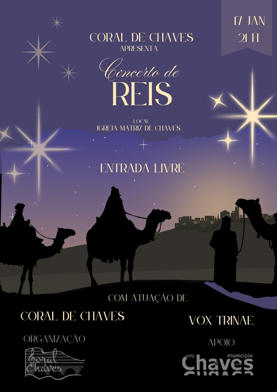 Concerto de Reis, para celebrar a tradição, a música e o espírito desta época tão especial. Com um repertório que percorre cânticos tradicionais e harmonias para aquecer o coração, este concerto promete um momento de beleza, partilha e emoção, assinalando o encerramento das festividades natalícias de forma única e memorável.