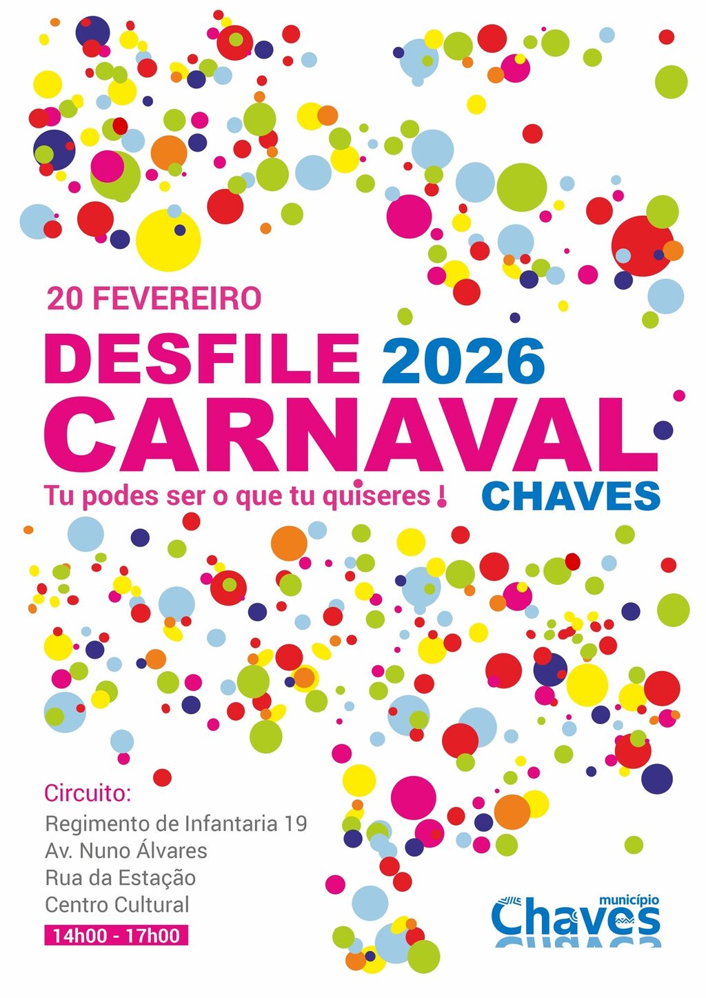 A atividade terá início às 14h00, junto ao Regimento de Infantaria n.º19, com um desfile ao longo da Avenida Nuno Álvares Pereira, culminando junto do edifício do Centro Cultural de Chaves com animação musical, dança e adereços de Carnaval (fitas coloridas, confeties, etc...)