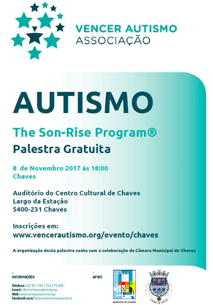 A Associação Vencer Autismo estará em Chaves, no Auditório do Centro Cultural de Chaves, para a realização de uma palestra, no próximo dia 8 de novembro de 2017, com início às 18 horas, com a duração de aproximadamente duas horas, sobre Autismo e o The Son-Rise Program. A organização desta palestra conta com a organização da Câmara Municipal de Chaves.