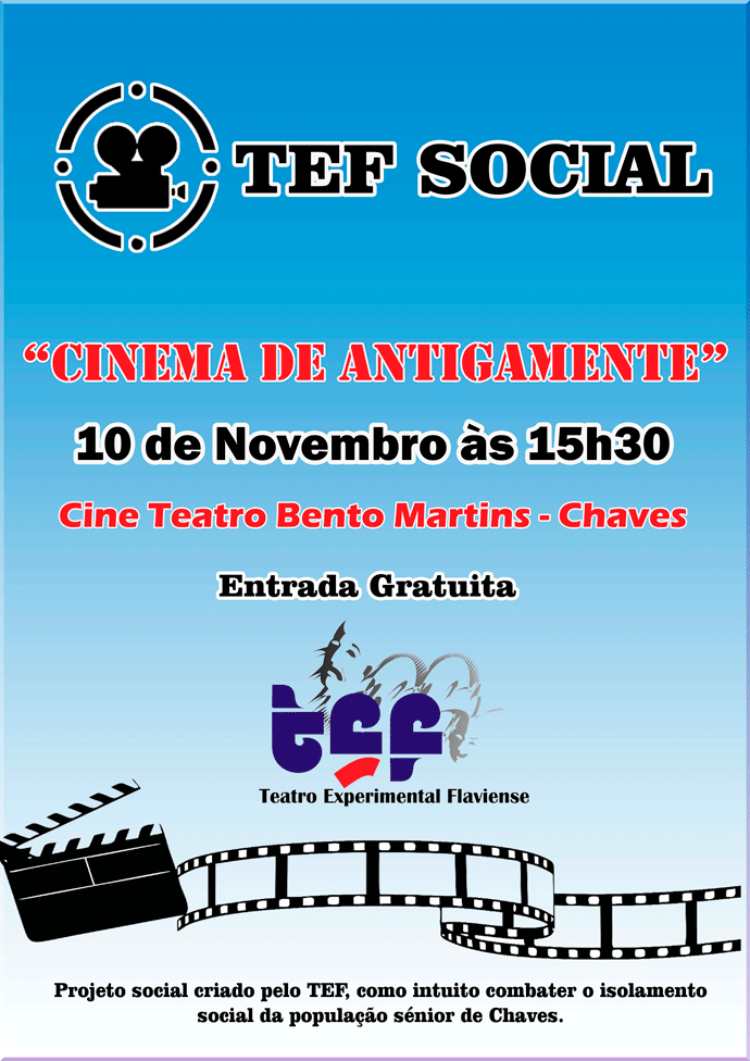 Projeto social criado pelo TEF, com a exibição dum filme antigo, que tem como intuito combater o isolamento social da população sénior de Chaves. Esta atividade irá realizar-se todas as segundas quintas-feiras de cada mês, com entrada gratuita para maiores de 60 anos.