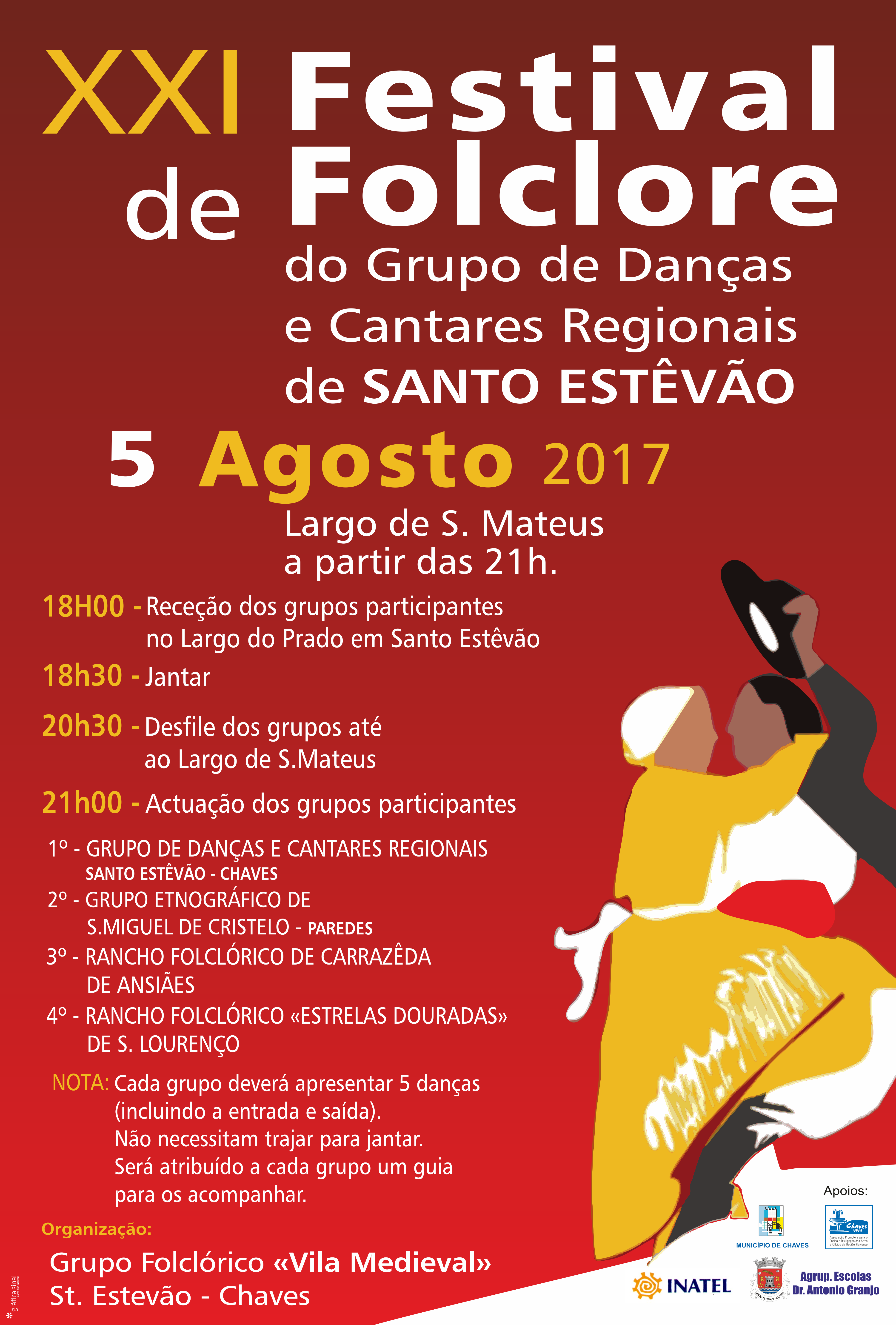 Adicionar a calendário2017-08-05 15:40:002017-08-05 15:40:00Europe/LisbonXXI FESTIVAL DE FOLCLORE DO GRUPO DE DANÇAS E CANTARES REGIONAIS DE SANTO ESTÊVÃOLargo de S. Mateus