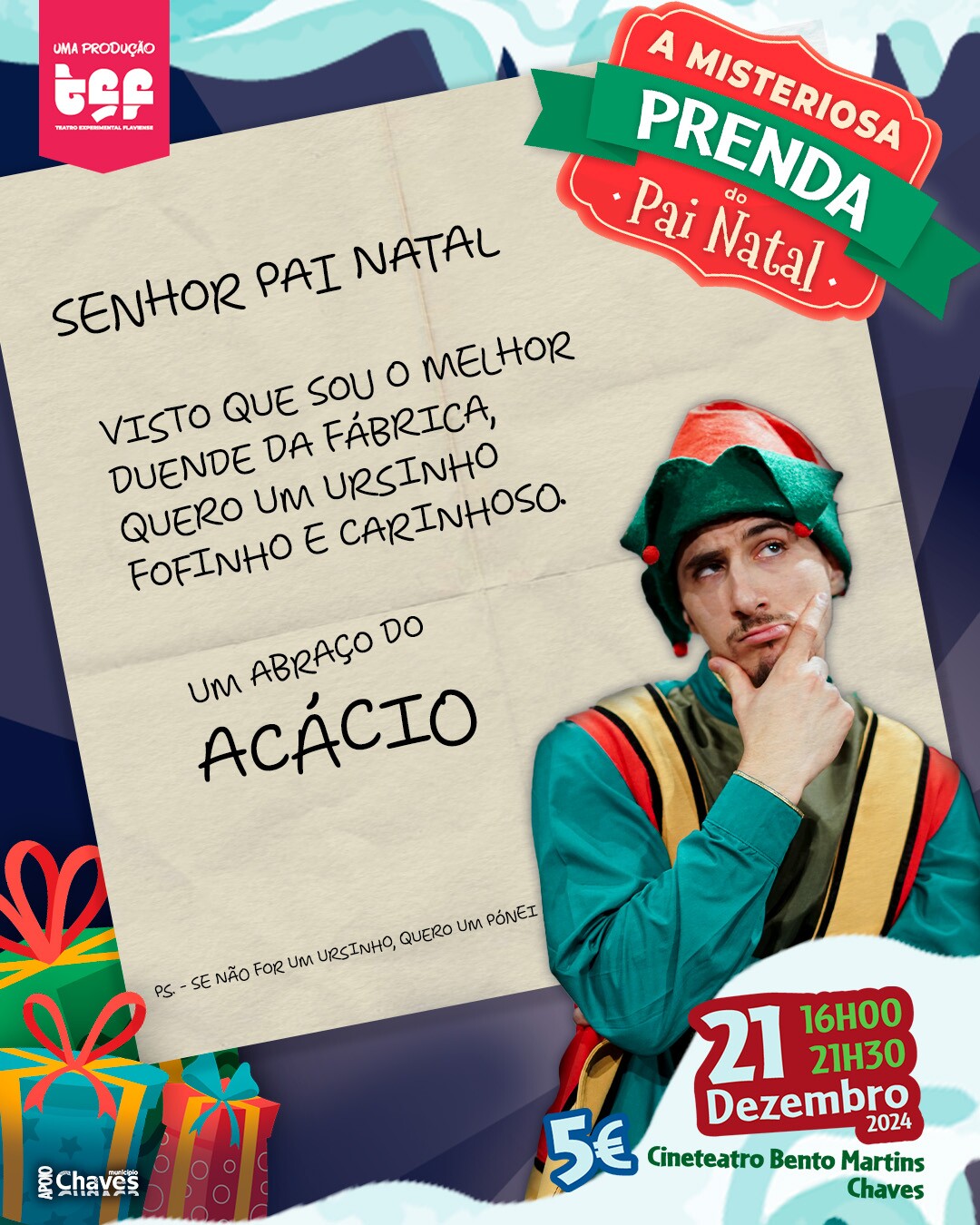 O Teatro Experimental Flaviense preparou para este Natal uma peça de teatro bem divertida para toda a família. "A misteriosa prenda do Pai Natal" sobe a palco no sábado, dia 21 de dezembro, com sessão dupla, às 16h00 e às 21h30.