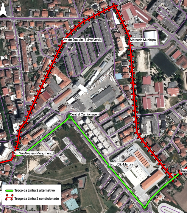 - A linha 2 será afetada no troço da Av. do Estádio e Av. Rui e Garcia Lopes (paragem Bairro Verde e Mercado). Alternativamente, os utentes poderão continuar a usufruir deste serviço recorrendo às paragens assinaladas no troço alternativo (Central de Camionagem e Escola Dr. Júlio Martins).