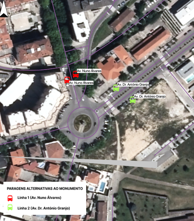 - As paragens habituais da linha 1, na Rotunda do Monumento, serão efetuadas no início da Av. Nuno Álvares, nos locais assinalados na imagem (a cor vermelha). As habituais paragens da linha 2, também na Rotunda do Monumento, serão efetuadas na Av. Dr. António Granjo, nos locais assinalados na imagem (a cor verde).