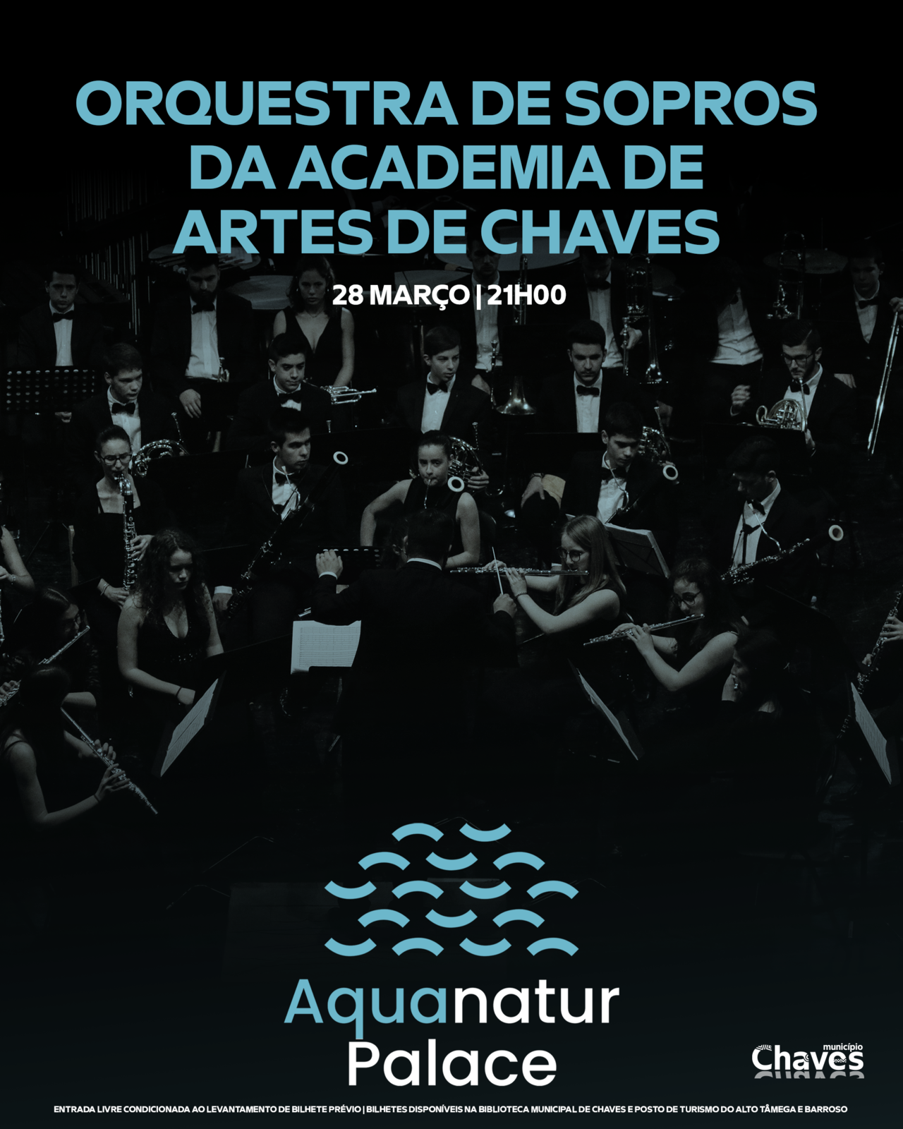 O “Aquanatur Palace” abre portas amanhã, dia 28 março, com a realização de um momento cultural. A Orquestra de Sopros da Academia de Artes de Chaves (AAC) leva a palco, pelas 21h00, o concerto “SPAERA”, estabelecendo um elo entre a grandiosidade do universo, a essência vital do nosso planeta e o vasto património natural e cultural do município de Chaves.