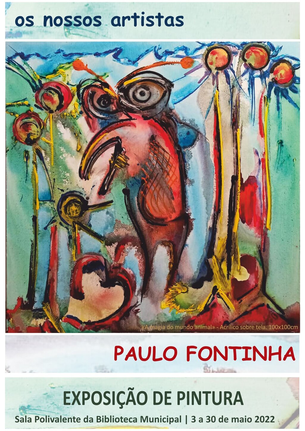 De 3 a 30 de maio, a Sala Polivalente da Biblioteca Municipal recebe a segunda exposição de pintura, no âmbito do Ciclo “Os Nossos Artistas”, um conjunto de obras do flaviense Paulo Fontinha.