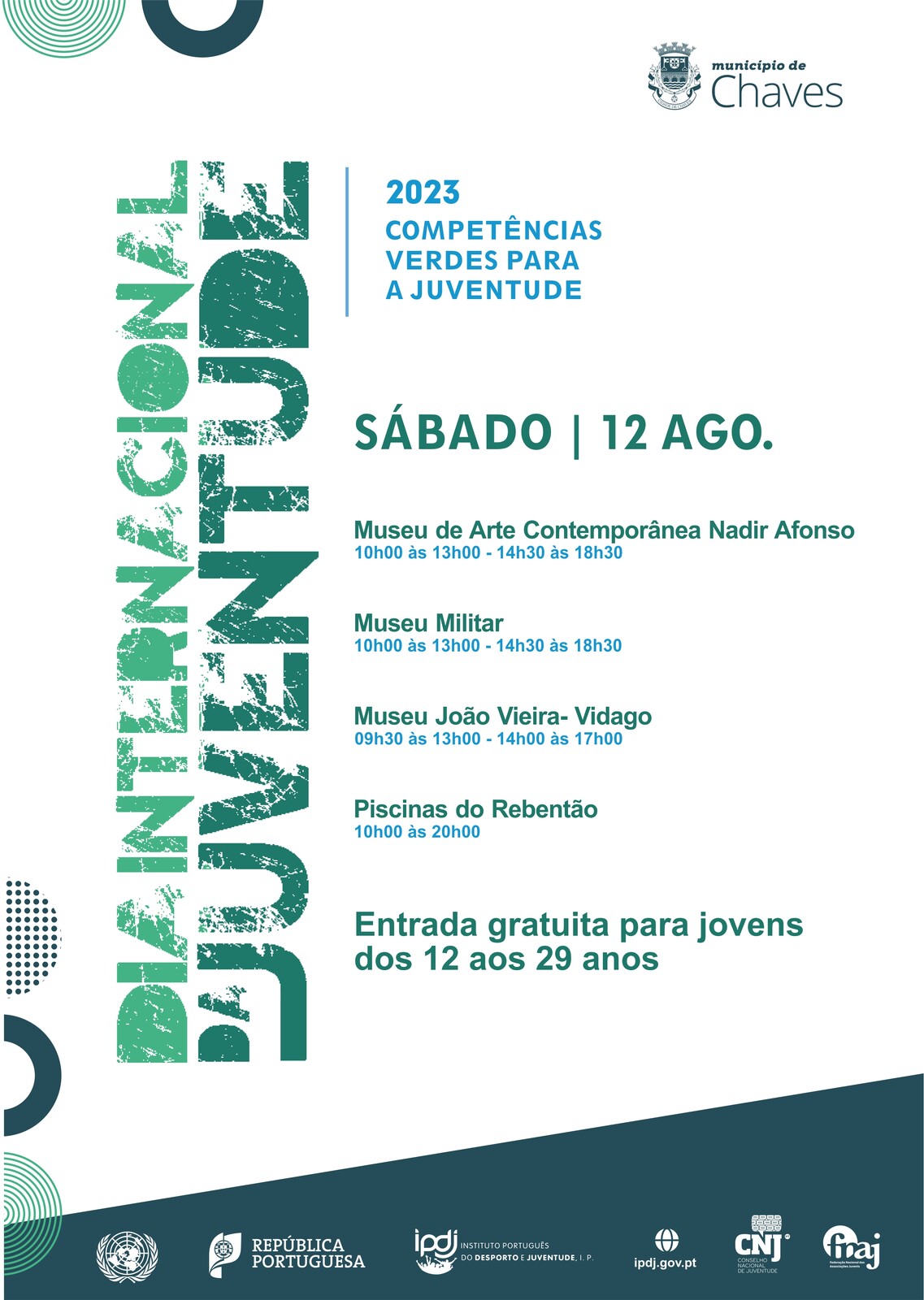 Este ano sob o mote “Competências verdes para a juventude: Rumo a um mundo sustentável”, o Município de Chaves associa-se ao Instituto Português do Desporto e Juventude na comemoração do Dia Internacional da Juventude, que se assinala no dia 12 de agosto.