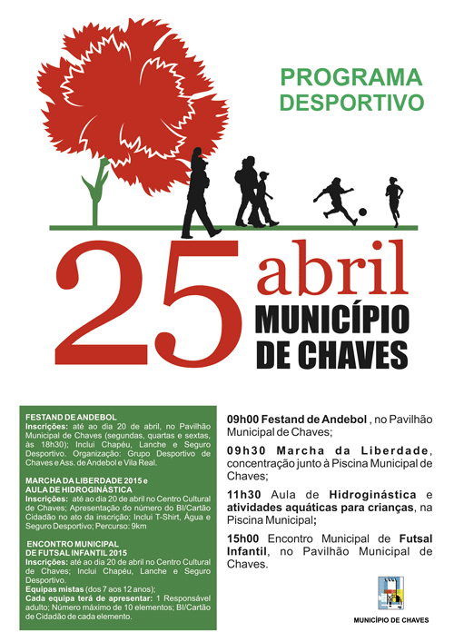 Pelas 09h00 decorrerá o Festand de Andebol, no Pavilhão Municipal de Chaves, seguindo-se pelas 09h30 a Marcha da Liberdade, com um percurso de 9 km, pelas principais ruas da cidade e ciclovia. A concentração será junto à Piscina Municipal. Recorde-se que a iniciativa contou no ano passado com a participação de mais de 160 pessoas, de todas as gerações.