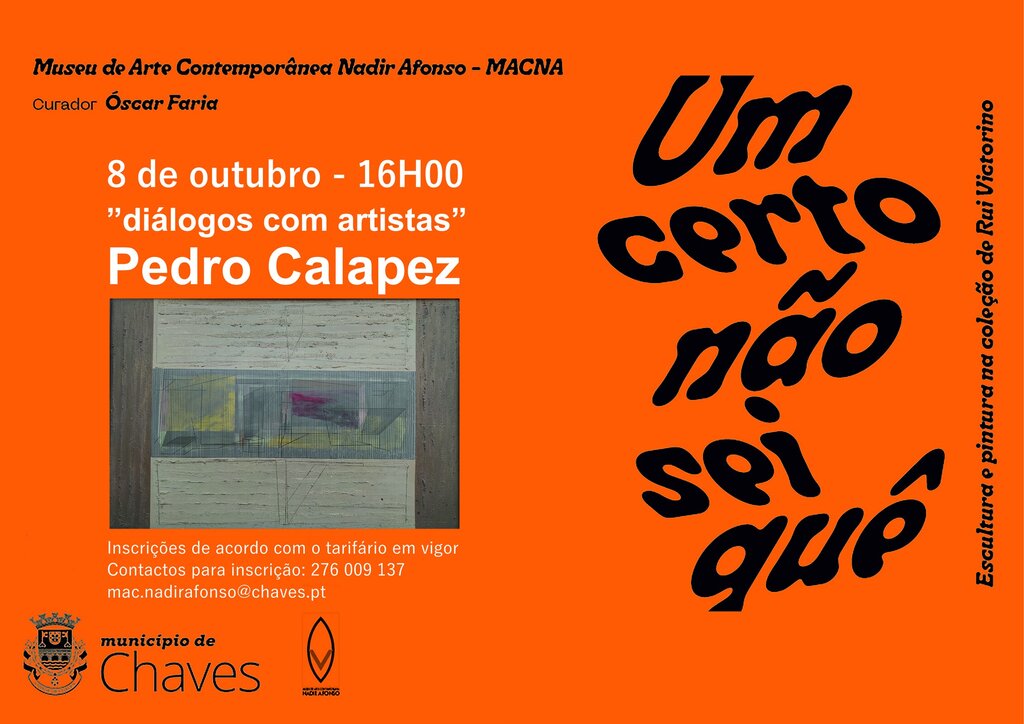 No próximo sábado, dia 8 de outubro, pelas 16h00, decorre a 2.ª sessão do ciclo de conversas intitulado “Um certo não sei quê: diálogos com artistas”, desenvolvido no âmbito das atividades de dinamização da atual exposição patente no Museu de Arte Contemporânea Nadir Afonso – MACNA e que conta com a participação do artista plástico Pedro Calapez.