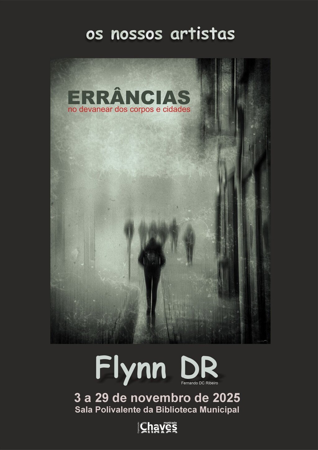 A Sala Polivalente da Biblioteca Municipal abre portas a uma nova exposição, desta vez de fotografias. “ERRÂNCIAS – a devanear entre corpos e cidades” dá nome à mostra, que integra o ciclo “Os Nossos Artistas” e reúne 70 obras da autoria de Flynn DR, heterónimo de Fernando DC Ribeiro.