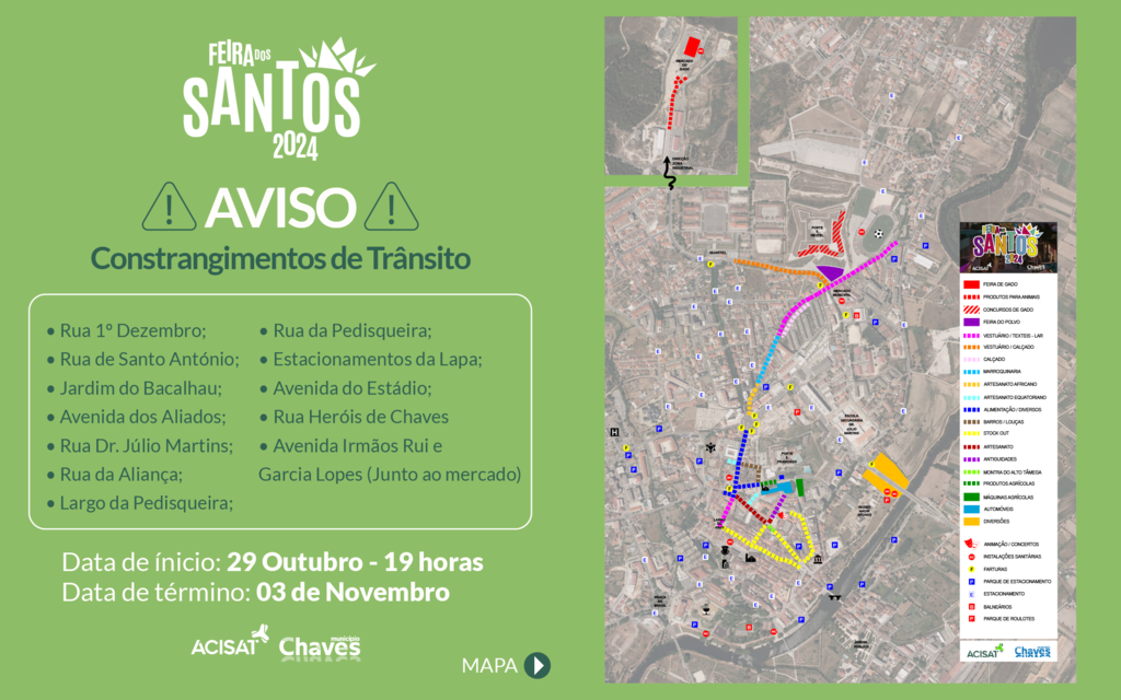 O Município informa que, no âmbito da dinamização da tradicional Feira dos Santos, bem como da montagem dos stands e expositores que antecedem a esta festividade, se irá proceder, já amanhã (terça-feira), dia 29 de outubro, pelas 19h00, ao corte de trânsito em toda a extensão da realização do evento, nomeadamente na Rua de Santo António, Rua 1º de Dezembro, Jardim do Bacalhau, Avenida dos Aliados, Rua Dr. Júlio Martins, Rua da Aliança, Rua e Largo da Pedisqueira, Rua Heróis de Chaves e parcialmente a Avenida Irmãos Rui Garcia Lopes, junto ao Mercado Municipal.