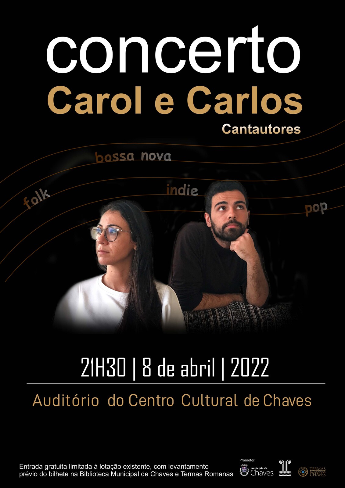 O Auditório do Centro Cultural vai ser palco do concerto “Carol e Carlos”, no próximo dia 8 de abril, sexta-feira, pelas 21h30, numa atuação intimista, suave e multidisciplinar, inserida na segunda edição do “Symposium Aqvae: Cidades Termais no Império Romano”.