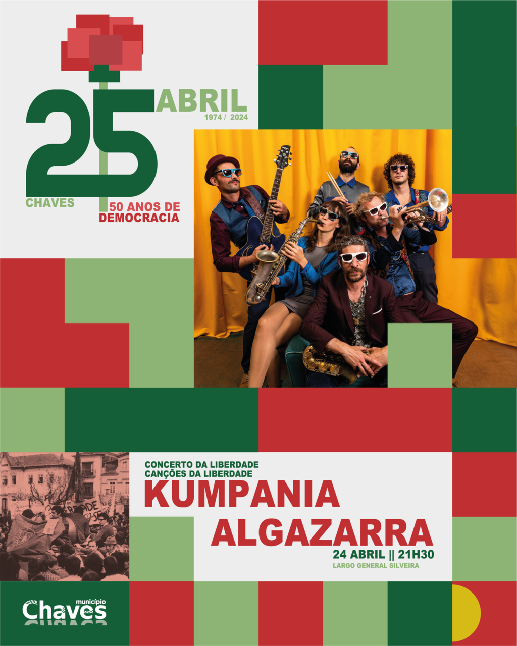 Inserido nas comemorações dos 50 anos do 25 de abril, o Município de Chaves apresenta, no próximo dia 24 de abril, pelas 21h30, um concerto imperdível alusivo à “Liberdade”, pela Kumpania Algazarra, no Largo General Silveira, enaltecendo a música como parte integrante deste fenómeno com repercussão mundial e com um grande cunho na história do nosso país.
