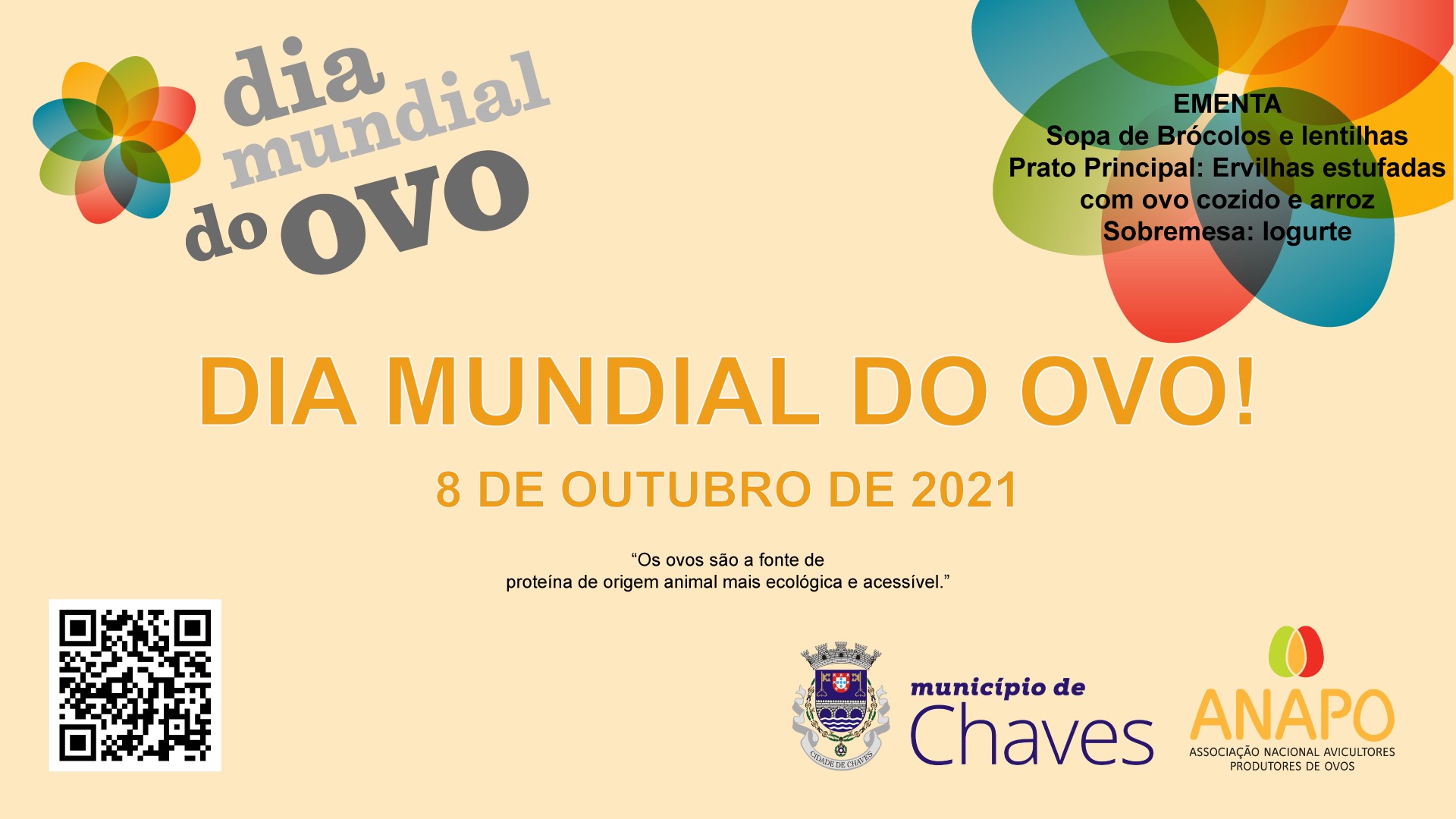 O Município de Chaves, considerando a iniciativa da ANAPO – Associação de Avicultores Produtores de Ovo para promoção do Dia Mundial do Ovo junto da comunidade escolar e da população em geral, participa hoje, dia 8 de outubro, nas ações de sensibilização para a temática com atividades a concretizar em ambiente de sala de aula orientadas pelos respetivos docentes.