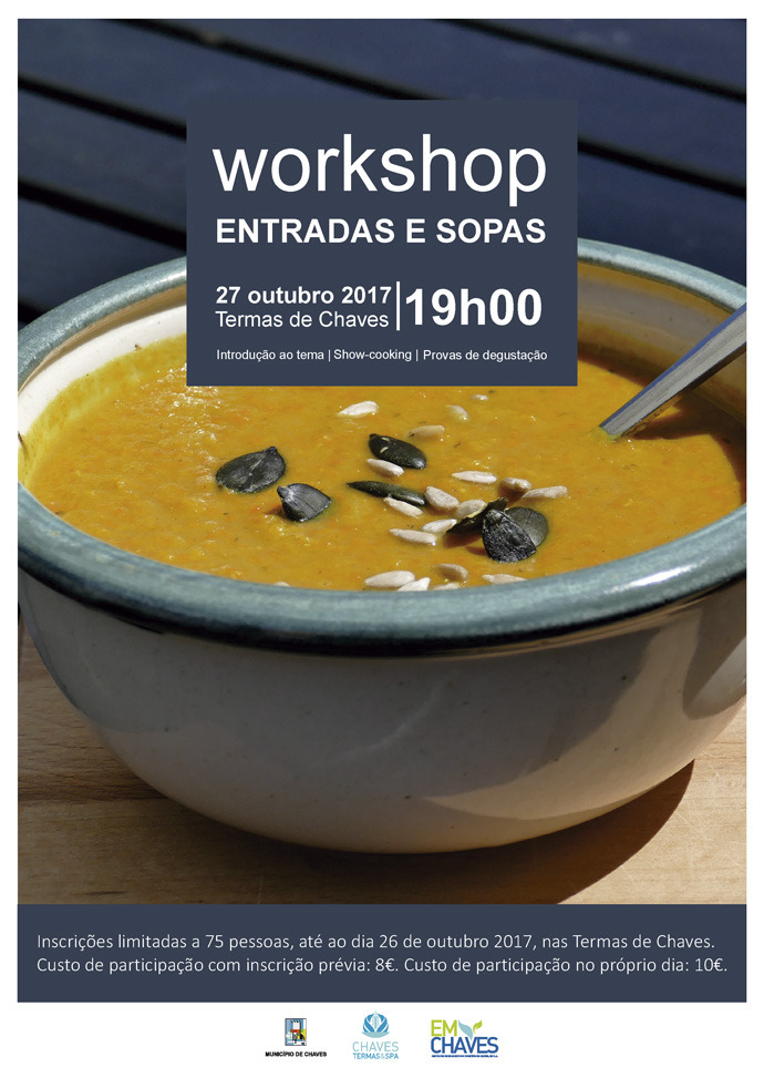 “Entradas e Sopas” é o tema do próximo workshop promovido pelas Termas de Chaves, que terá lugar no dia 27 de outubro, como habitualmente no balneário termal, com início marcado para as 19h00.