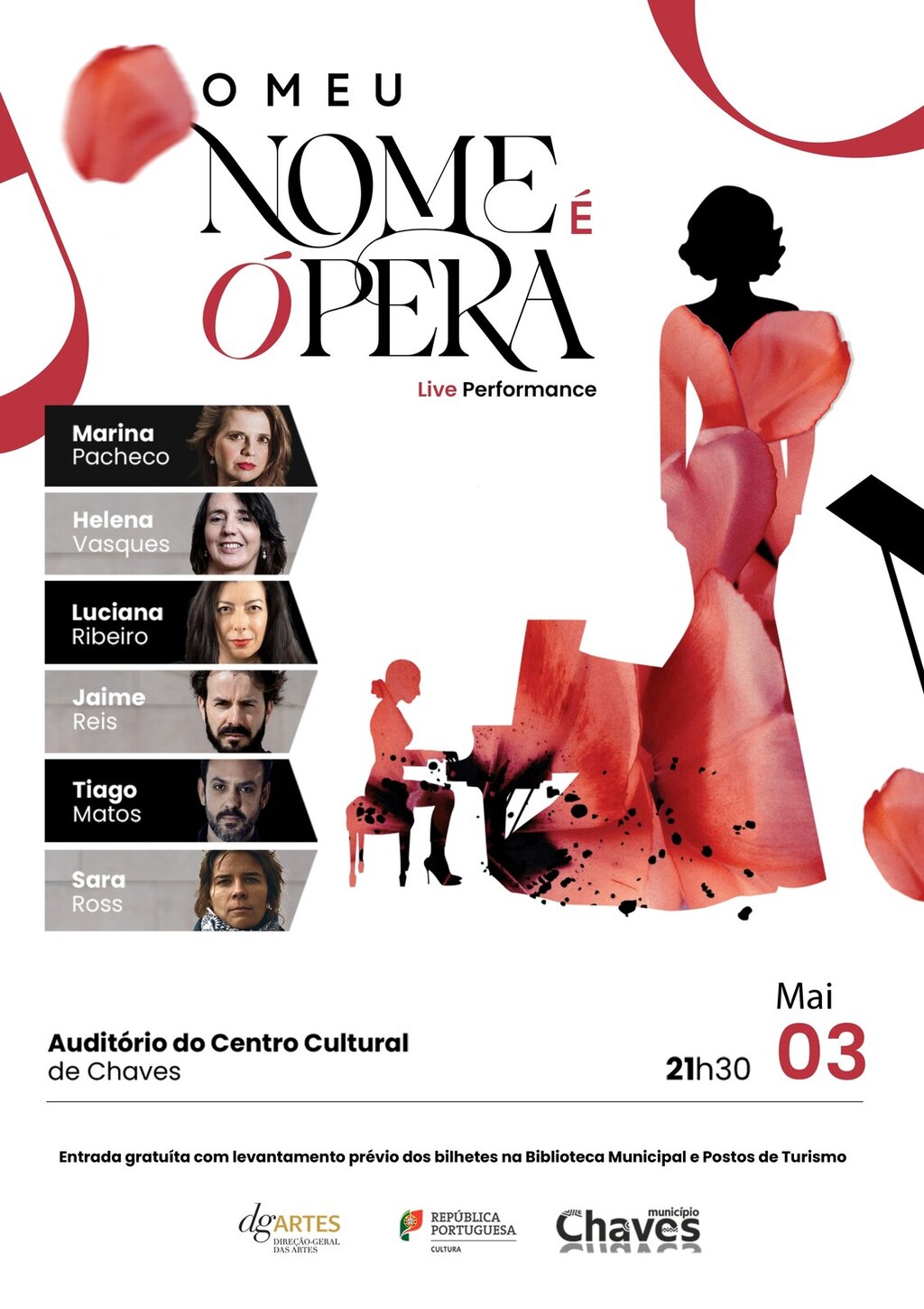 O Auditório do Centro Cultural de Chaves recebe, no próximo sábado, dia 3 de maio, pelas 21h30, o espetáculo de música e teatro "O meu nome é Ópera". Este espetáculo traz uma abordagem crítica e intimista sobre o papel da mulher no teatro musical, utilizando a ópera como ponto de partida. Um olhar contemporâneo e intimista sobre figuras femininas do mundo da ópera.