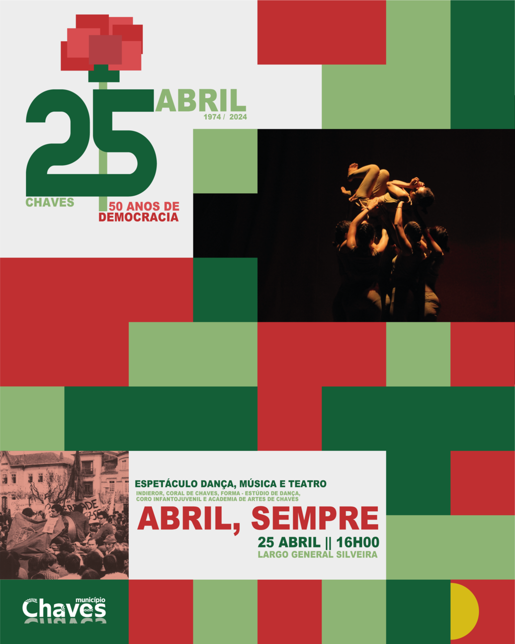 Amanhã, pelas 16h00, no Largo General Silveira, terá lugar o espetáculo "Abril Sempre", que contará com a participação da Associação INDIEROR, FORMA, Coro Infanto-Juvenil do Agrupamento de Escolas Dr. Julio Mártins, Coral de Chaves e Academia de Artes de Chaves.