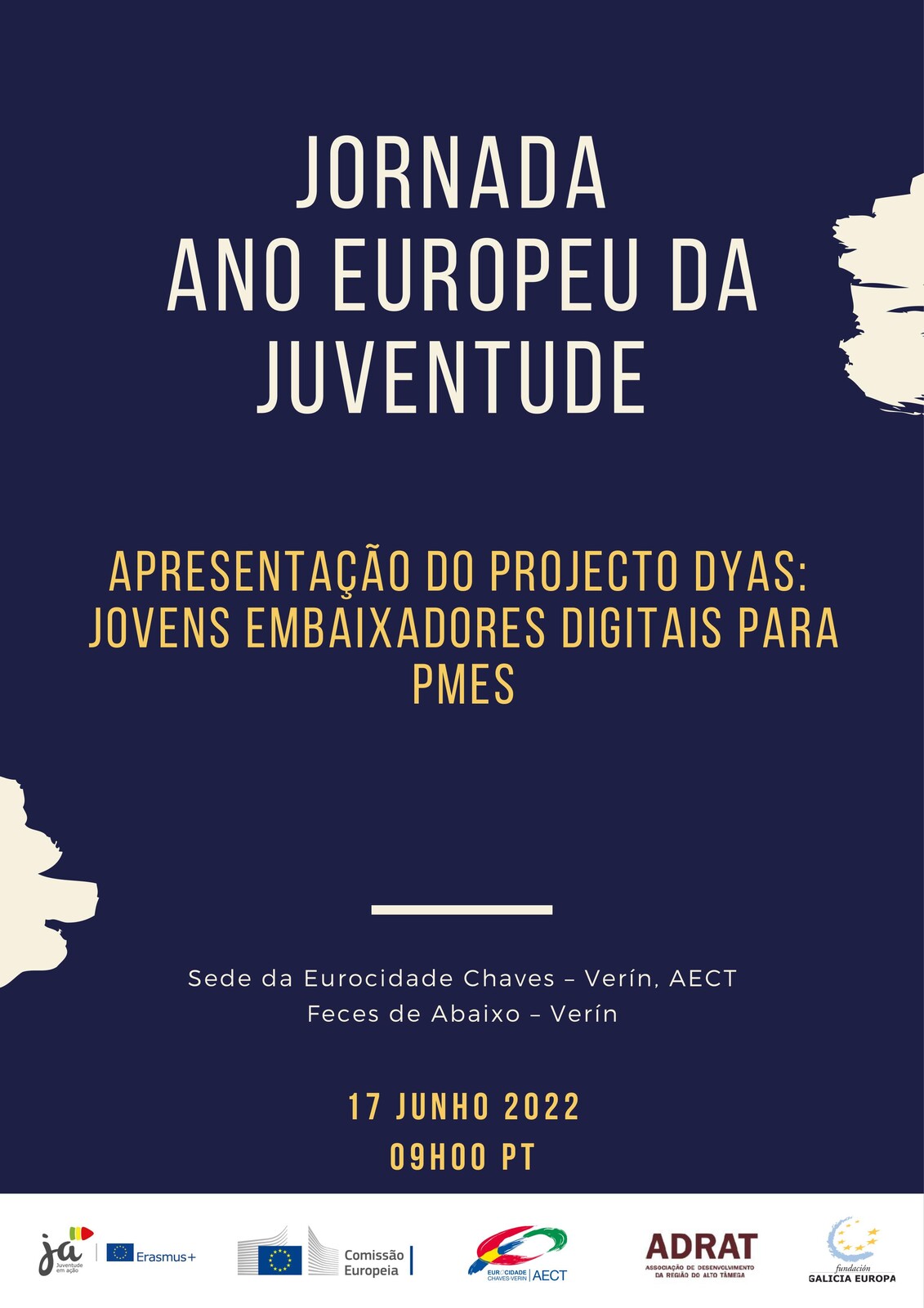 A Eurocidade de Chaves-Verín, AECT vai apresentar na sua sede, no próximo dia 17 de junho (sexta-feira), pelas 09h00, o projeto "Jovens Embaixadores Digitais para PMEs", aprovado pelo programa Erasmus+ na jornada "2022: Ano Europeu da Juventude" na sede da Eurocidade Chaves-Verín.