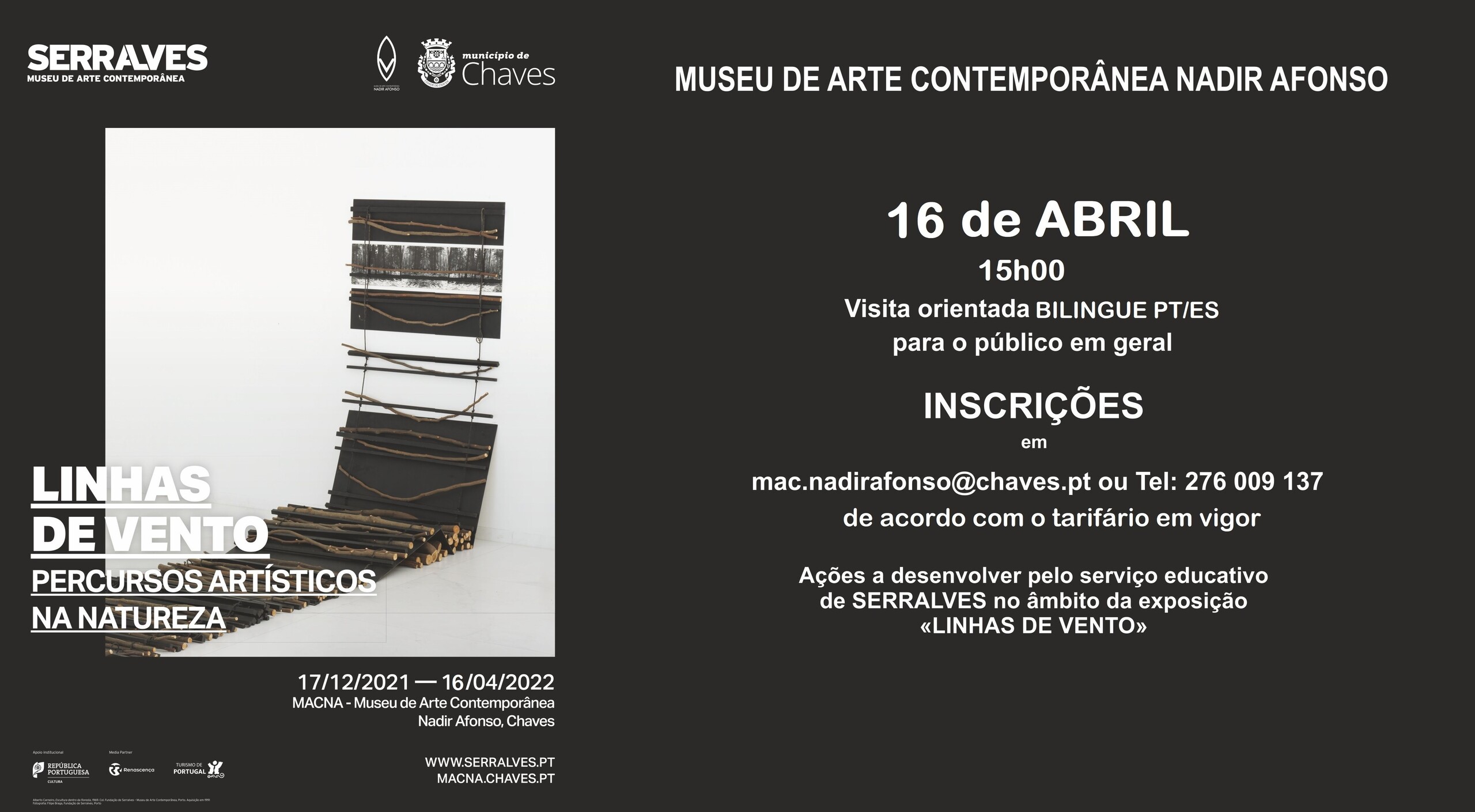 Ainda no âmbito da exposição "Linhas de vento. Percursos artísticos na natureza", o Serviço Educativo de Serralves, em parceria com o Município, promove no MACNA - Museu de Arte Contemporânea Nadir Afonso uma visita orientada (em português e espanhol) à referida mostra, destinada ao público em geral, no próximo dia 16 de abril (sábado) pelas 15h00. Esta é mais uma ação, dando continuidade às atividades educativas promovidas neste espaço museológico.