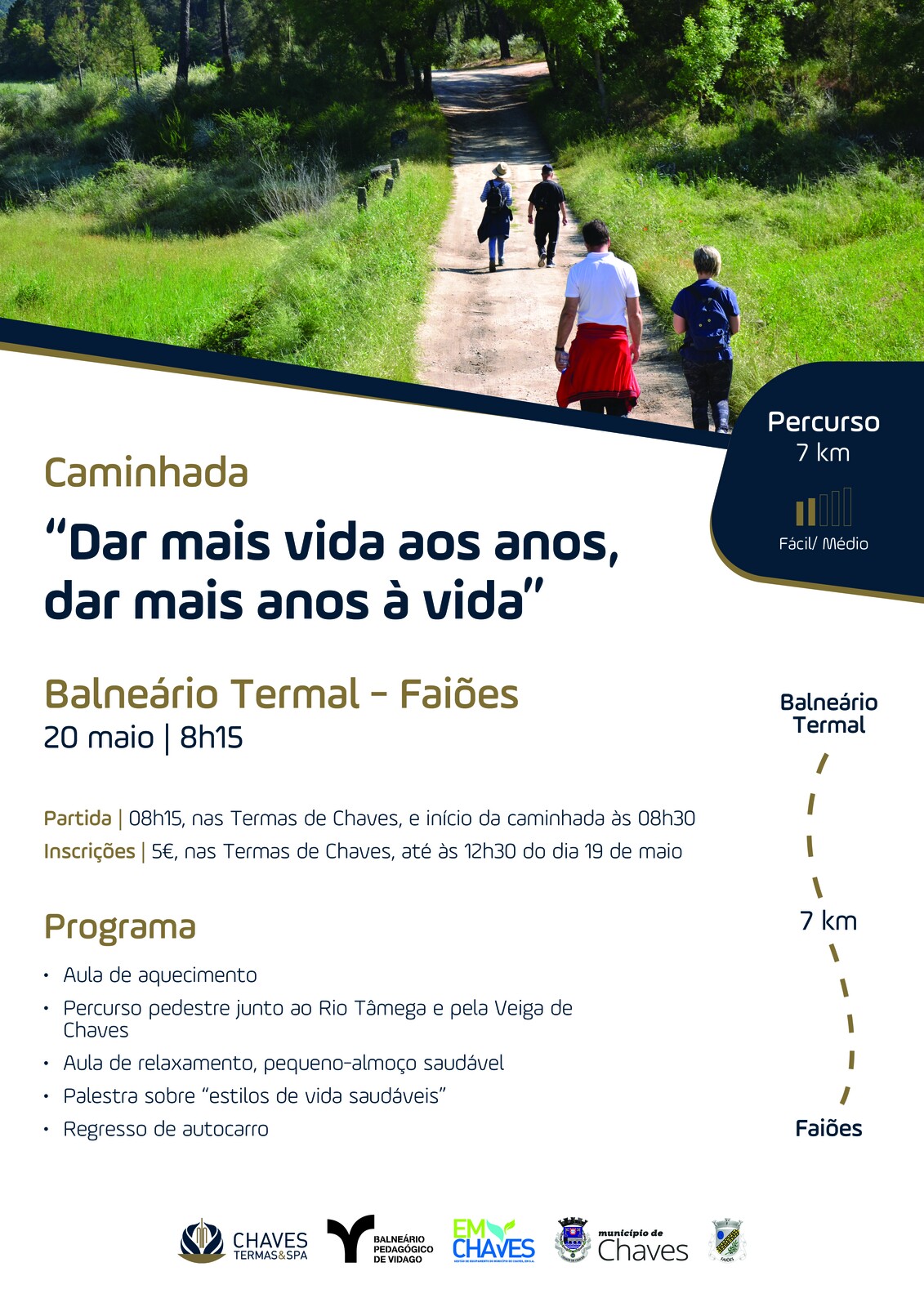 As Termas de Chaves, promovem, no próximo dia 20 de maio (sábado), a primeira caminhada deste ano, com destino a Faiões. Sob o mote “Dar mais vida aos anos, dar aos anos mais vida” esta iniciativa pretende estimular hábitos de vida saudável junto da população, promovendo também o património natural do concelho.