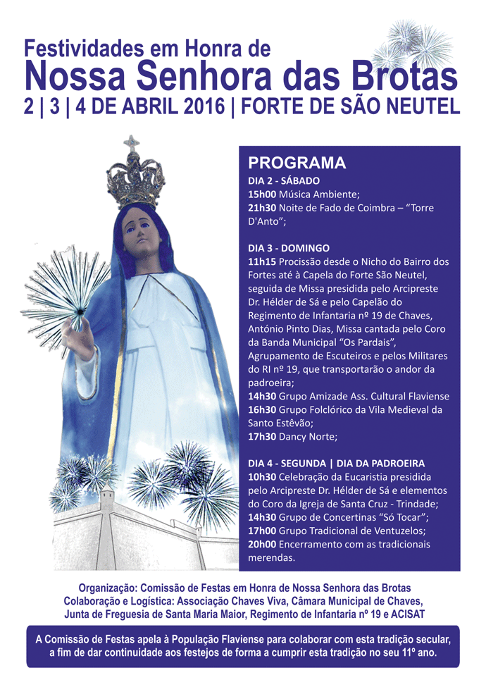 A Senhora das Brotas é a primeira festa do ano na cidade de Chaves, razão pela qual a Comissão de Festas convida toda a população a marcar presença na mesma. A Comissão de Festas apela ainda à população para colaborar com esta tradição secular, com vista a dar continuidade aos festejos de forma a cumprir esta tradição.