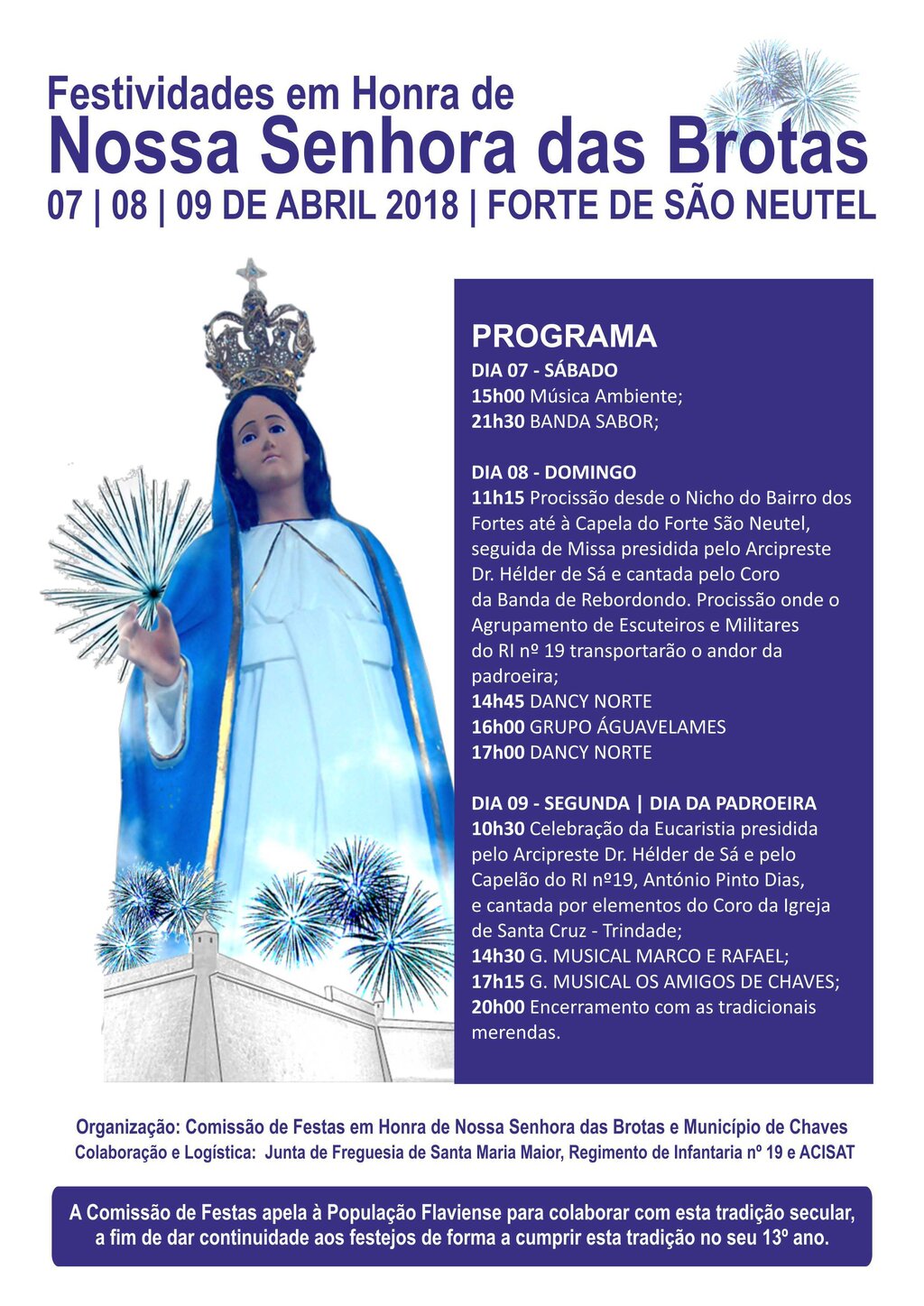 O evento é organizado pela Comissão de Festas em Honra de Nossa Senhora das Brotas, em colaboração com o Município de Chaves, Junta de Freguesia de Santa Maria Maior, Regimento de Infantaria N° 19 e Associação Empresarial do alto Tâmega.