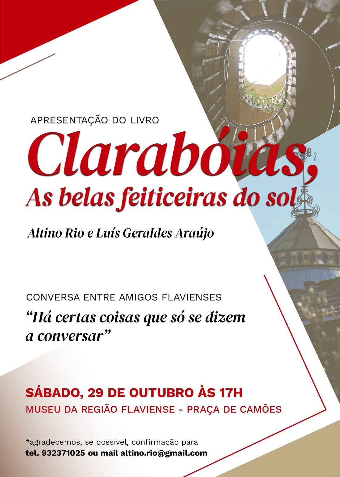 Chaves vai receber a apresentação do livro “Clarabóias, as belas feiticeiras do sol”, no próximo sábado, dia 29 de outubro, pelas 17h00, no Museu da Região Flaviense, uma obra da autoria de Altino Rio e Luís Geraldes, em colaboração com Herculano Pombo.