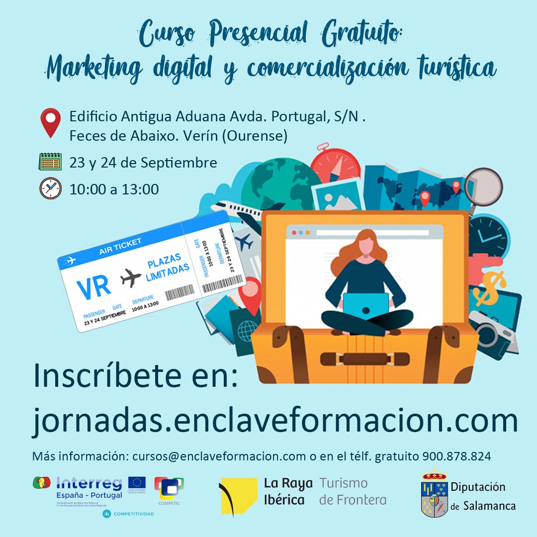 Irá decorrer na sede da Eurocidade Chaves-Verín, AECT um curso de formação em Marketing Digital e Comercialização Turística, nos dias 23 e 24 de Setembro, com as seguintes temáticas: Introdução ao Marketing Turístico, Estratégias de Marketing Digital e Comercialização Turística, Instrumentos para realizar campanhas turísticas digitais, Turismo acessivel e sustentável e Elaboração de um plano de marketing online para a comercialização turística.