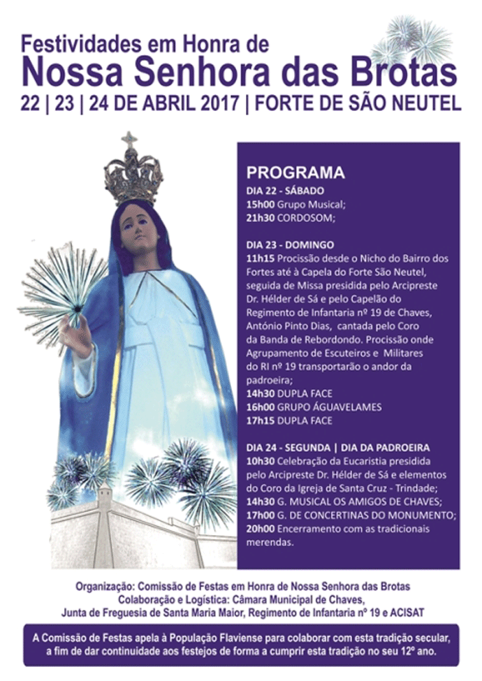 11h15 Procissão desde o Nicho do Bairro dos Fortes até à Capela do Forte de São Neutel, seguida de Missa presidida pelo Arcipreste Dr. Hélder de Sá e pelo Capelão do Regimento de Infantaria nº 19 de Chaves, António Pinto Dias, cantada pelo Coro da Banda de Rebordondo. Procissão onde o Agrupamento de Escuteiros e os Militares do RI nº 19 transportarão o andor da padroeira;