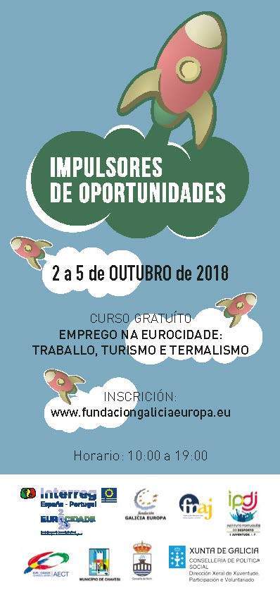 A Fundación Galicia Europa vai promover o curso "Facilitadores de Oportunidades - Emprego na Eurocidade: trabalho, turismo e termalismo", que se realizará entre os dias 2 e 5 de outubro, na sede da Eurocidade Chaves-Verín, na antiga alfândega em Feces de Abaixo. O curso oferece formação teórica e prática sobre desenvolvimento turístico e património cultural, sendo uma oportunidade para a criação de empresas, para iniciar um negócio, para construir um futuro na Eurocidade.