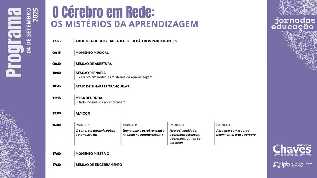 O Município, em parceria com o Instituto Politécnico de Bragança, vai realizar, no próximo dia 4 de setembro, a segunda edição das Jornadas da Educação, este ano subordinadas ao tema “O Cérebro em Rede: Os Mistérios da Aprendizagem”.