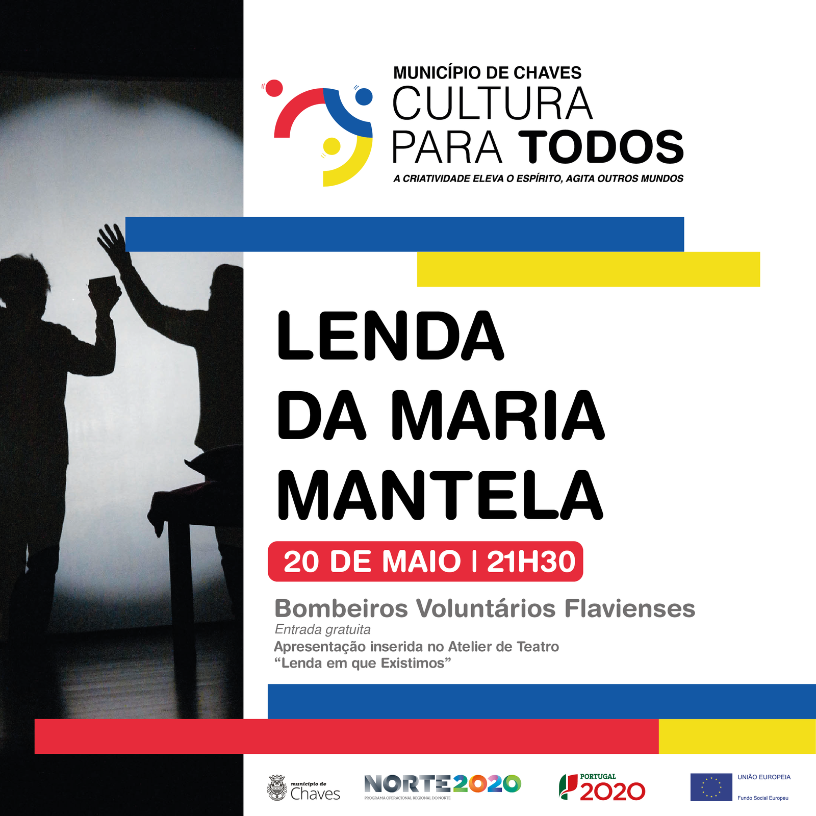 O Atelier de Teatro do projeto “Cultura Para Todos” chega ao seu ato final, pelas 21h30, do próximo dia 20 de maio (sexta-feira), tendo como palco a Praça do Campo da Fonte, junto ao edifício dos Bombeiros Voluntários Flavienses.