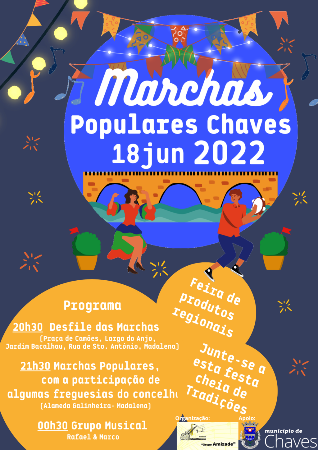 As Marchas Populares de Chaves pretendem encher de cor, animação, música e coreografias harmoniosas o núcleo histórico da cidade flaviense, já no próximo dia 18 de junho (sábado). A iniciativa é organizada pela Associação Cultural Flaviense Grupo Musical Amizade, com o apoio da autarquia flaviense e contará com duas centenas de participantes, distribuídos por vários grupos de marchantes.