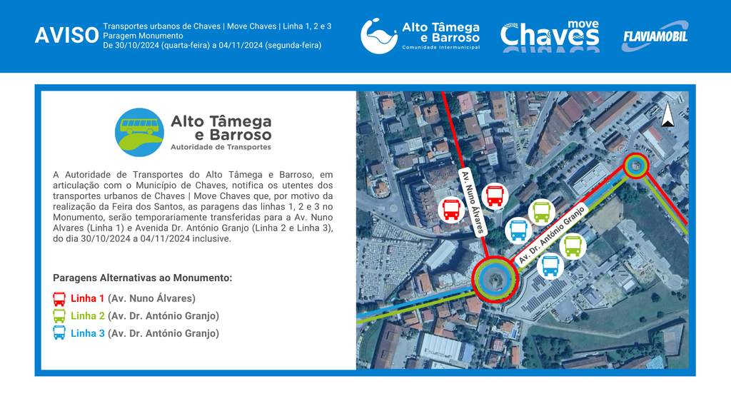 Sob a coordenação da Comunidade Intermunicipal do Alto Tâmega e Barroso (CIMAT) enquanto Autoridade de Transportes, o município vem informar os utentes dos transportes urbanos de Chaves, Move Chaves, que, no âmbito da realização da Feira dos Santos, as paragens das Linhas 1, 2 e 3 no Monumento serão temporariamente transferidas para a Av. Nuno Álvares (Linha 1) e Av. Dr. António Granjo (Linha 2 e 3), no período compreendido entre o dia 30 de outubro (quarta-feira) e o dia 4 de novembro (segunda-feira).