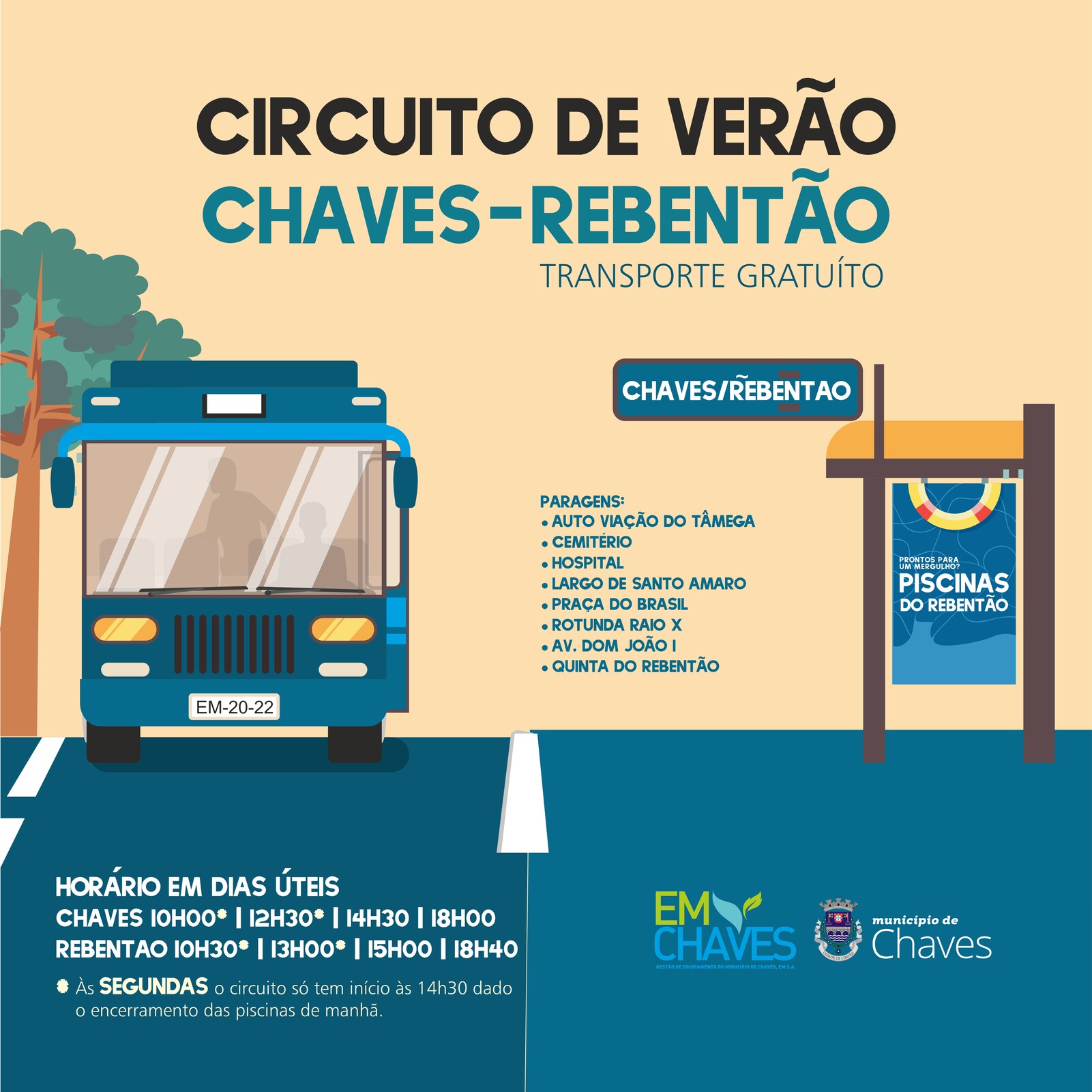 O Município de Chaves assegura, a partir do próximo dia 1 de julho (sexta-feira), transporte coletivo de passageiros gratuito para as Piscinas do Rebentão, durante os meses de julho e agosto.