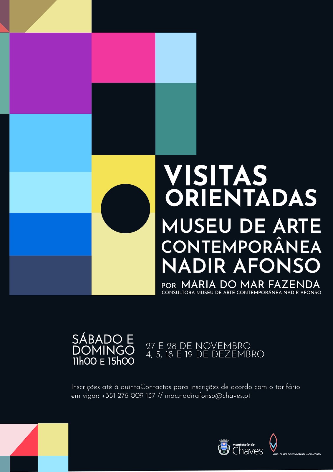 Nos sábados e domingos de 27 e 28 de novembro e 04 e 05 de dezembro, pelas 11h00 e 15h00 serão efetuadas visitas orientadas às exposições do programa comemorativo do centenário de Nadir Afonso: "Nadir Afonso, entre o local e o global", "Arquitetura de Nadir Afonso em Chaves" e "Da Figuração à Abstração".