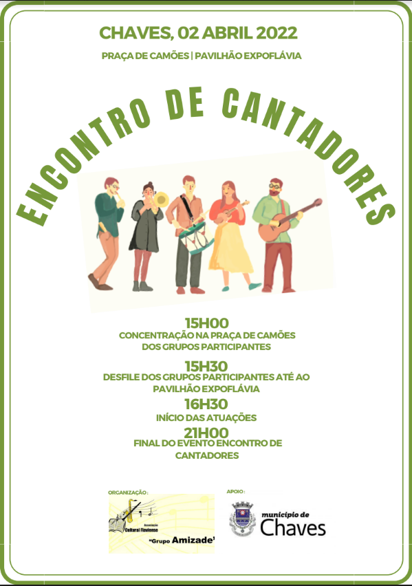 A Associação Cultural Flaviense “Grupo Amizade” e a Câmara Municipal de Chaves organizam, no próximo sábado, dia 2 de abril, o Encontro de Cantadores, com receção dos grupos participantes, na Praça de Camões, pelas 15h00.