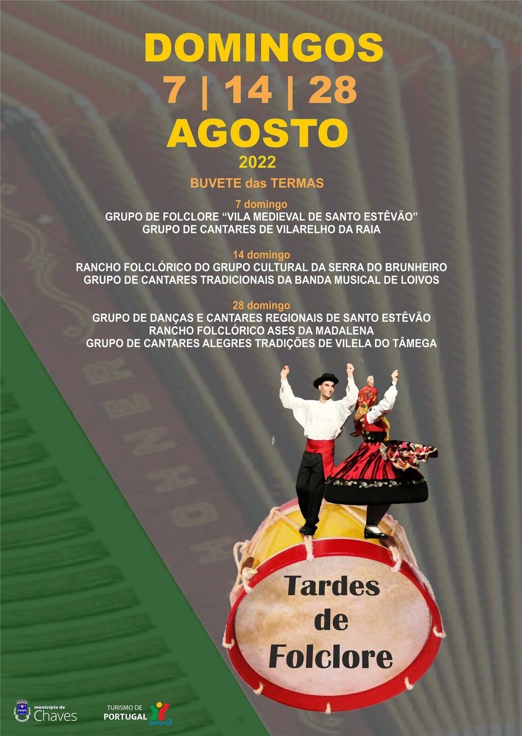 As Termas de Chaves serão novamente palco de uma Tarde de Folclore, no próximo domingo, dia 14 de agosto, pelas 16h00, com as atuações do Rancho Folclórico do Grupo Cultural da Serra do Brunheiro e Grupo de Cantares Tradicionais da Banda Musical de Loivos.