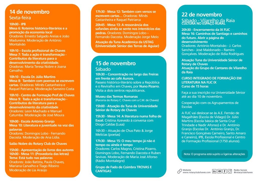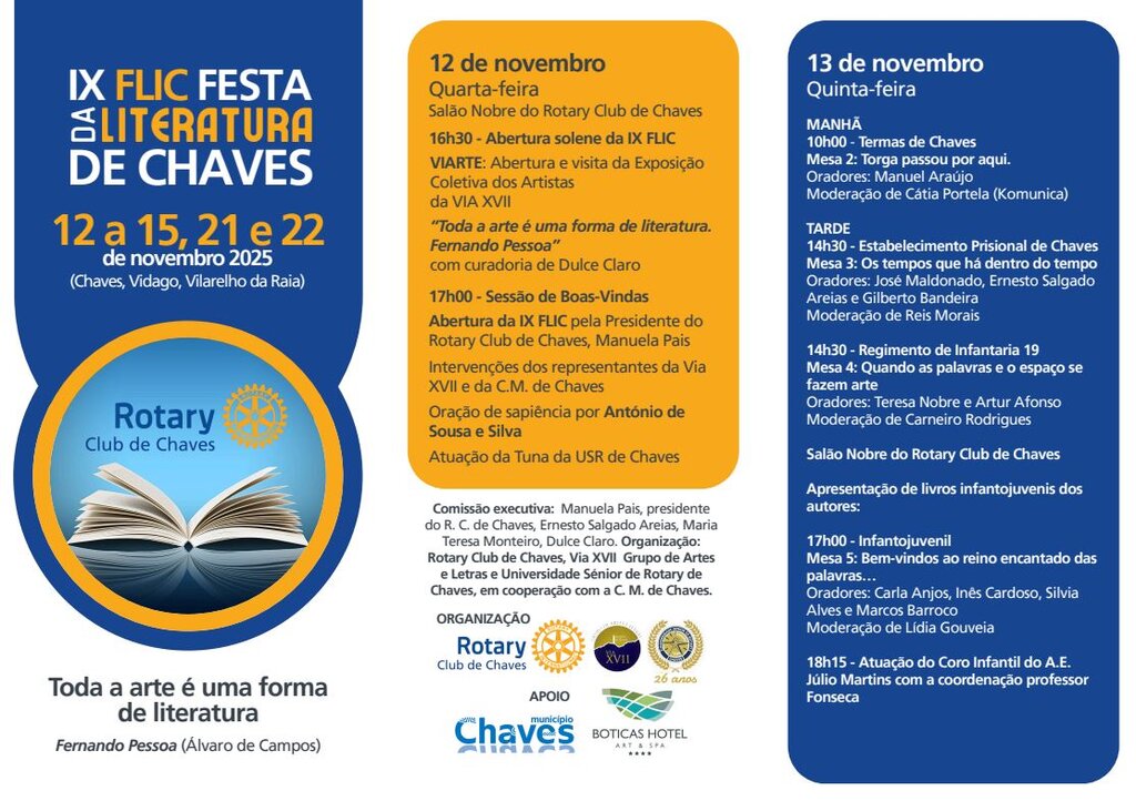 Organizada pelo Rotary Club de Chaves, Via XVII - Grupo de Artes e Letras e Universidade Sénior de Rotary de Chaves, em colaboração com o Município, no âmbito do Protocolo de Colaboração de Desenvolvimento Cultural, a FLIC propõe um programa diversificado que inclui mesas temáticas, apresentações de livros, intervenções artísticas e formações literárias.