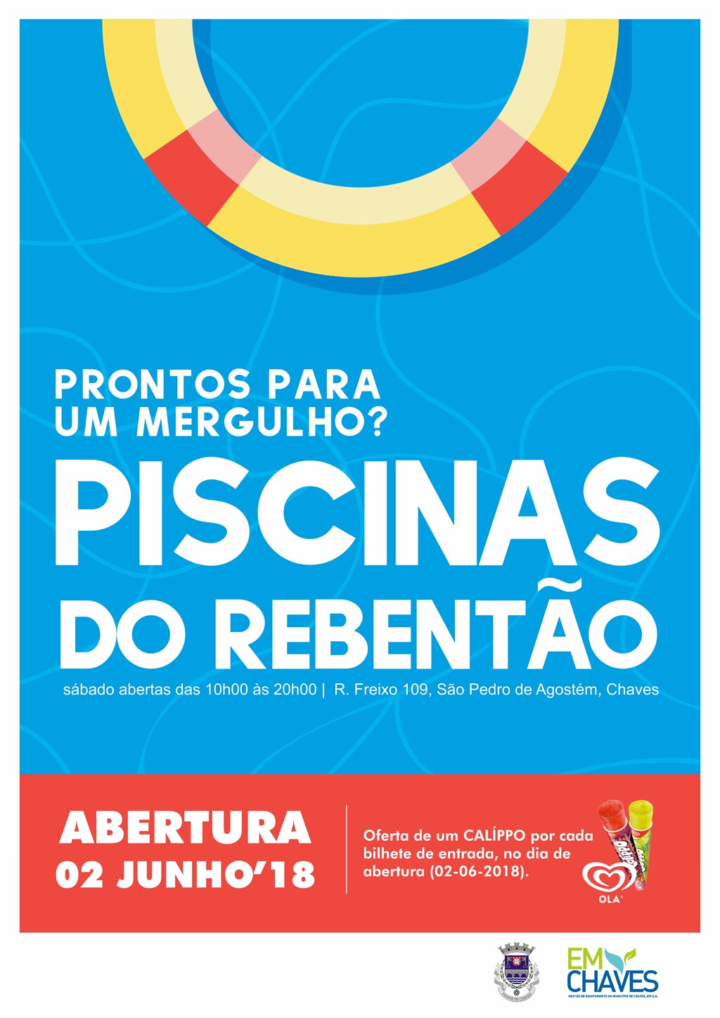 As Piscinas do Rebentão vão abrir para mais uma época balnear no próximo sábado, dia 02 de junho. As Piscinas estarão abertas ao público todos os dias, inclusive feriados, com os seguintes horários: segunda-feira das 14h00 às 20h00, de terça-feira a domingo das 10h00 às 20h00.