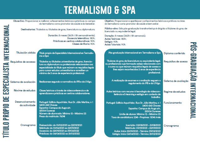 Tendo como objetivo fundamental a qualificação e especialização de profissionais para a prestação de serviços diferenciados em estâncias Termais e SPAs, mas também para desenvolvimento de uma linha de investigação ligada à salutogénese pela água, esta Pós-Graduação transfronteiriça é dirigida a titulares do grau de licenciado ou equivalente legal e terá uma duração de 360 horas (8 meses), repartidas entre aulas teóricas (180h), estágio (90h) e aulas tutoriais (90h).