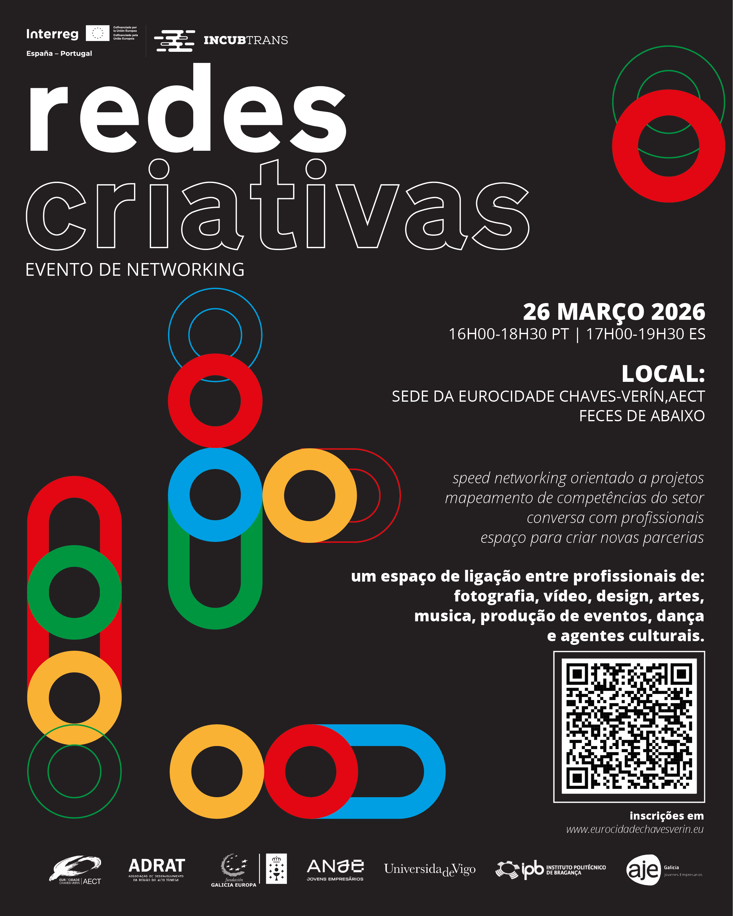 A participação é gratuita, mediante inscrição obrigatória até às 13h00 do dia 24 de março, através do formulário disponível em https://eurocidadechavesverin.eu/agenda/atividades-eurocidade/2026/poi/redes-criativas-evento-de-networking