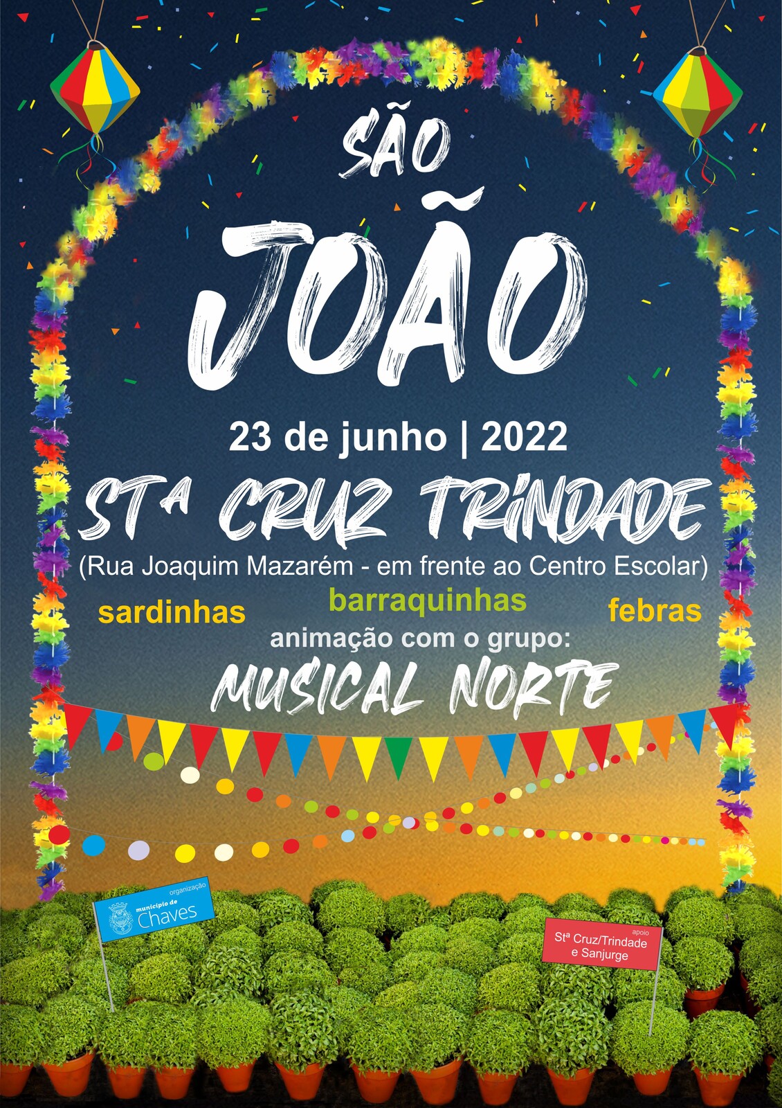 A 2º edição desta festa popular, dinamizada com o apoio da Junta de Freguesia de Santa Cruz/Trindade e Sanjurge, promete animar a noite de todos os flavienses com a atuação do Grupo Musical Norte, comida típica, boa disposição e um espetáculo pirotécnico na continuidade do “bailarico”.