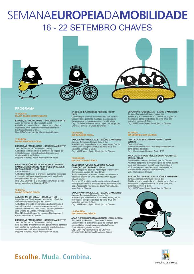 Arranca amanhã (dia 17 de setembro) a Semana Europeia da Mobilidade em Chaves. Como tem vindo a acontecer desde o ano de 2003, o Município não ficou de fora desta iniciativa promovida pela Comissão Europeia e juntou-se a 42 outras localidades portuguesas e a muitas mais espalhadas pelo continente europeu que procuram chamar à atenção para a necessidade de implementação e promoção de medidas de transporte sustentáveis e mais amigas do ambiente.