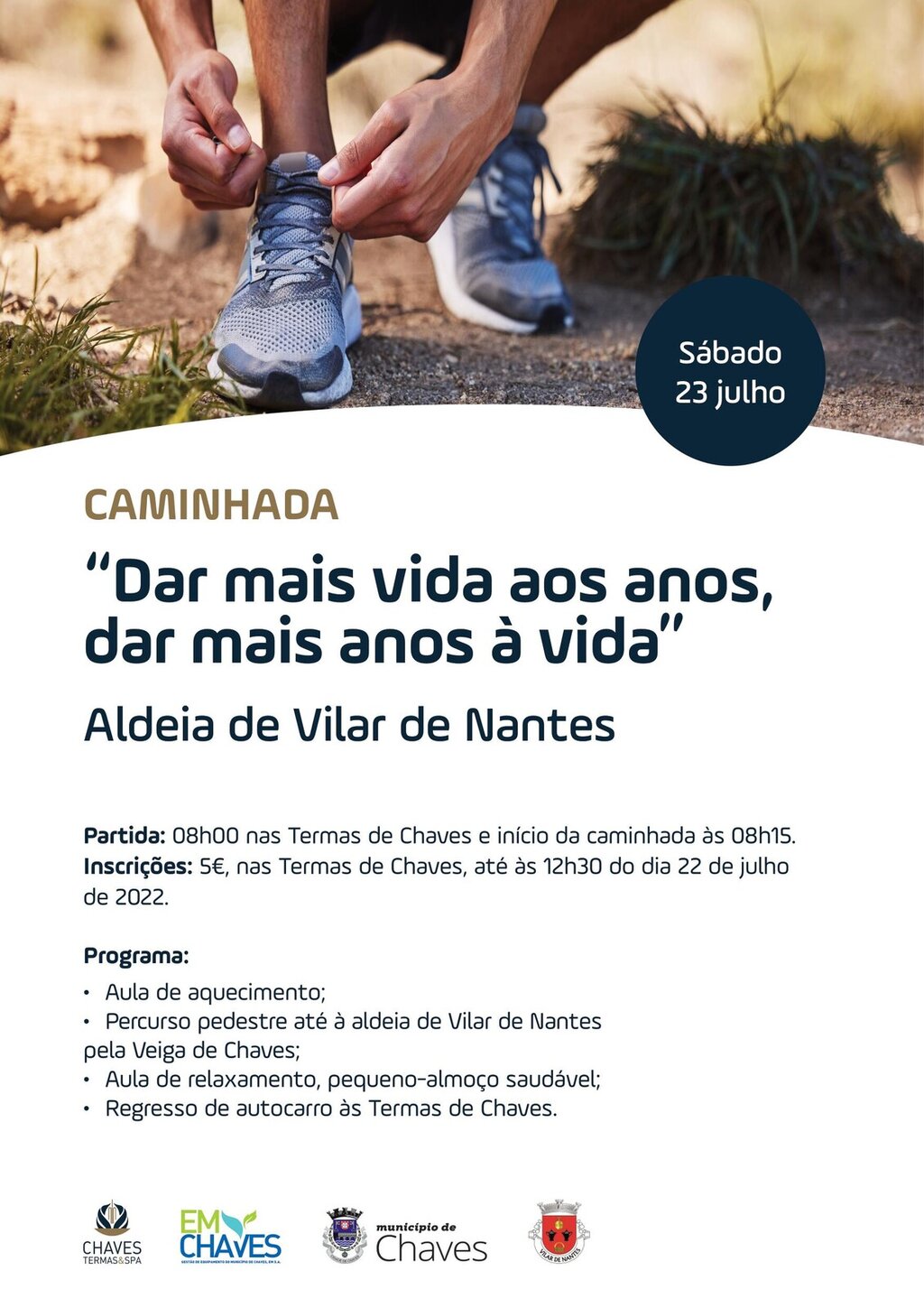 A caminhada decorrerá pela veiga de Chaves e os participantes poderão contar ainda com uma aula de relaxamento e um pequeno-almoço saudável. Após visita à aldeia de Vilar de Nantes, com especial destaque para o artesanato de cerâmica e cestaria, decorrerá uma palestra sobre “Estilos de vida saudáveis” a cargo do nutricionista das Termas de Chaves, Filipe Ferreira.