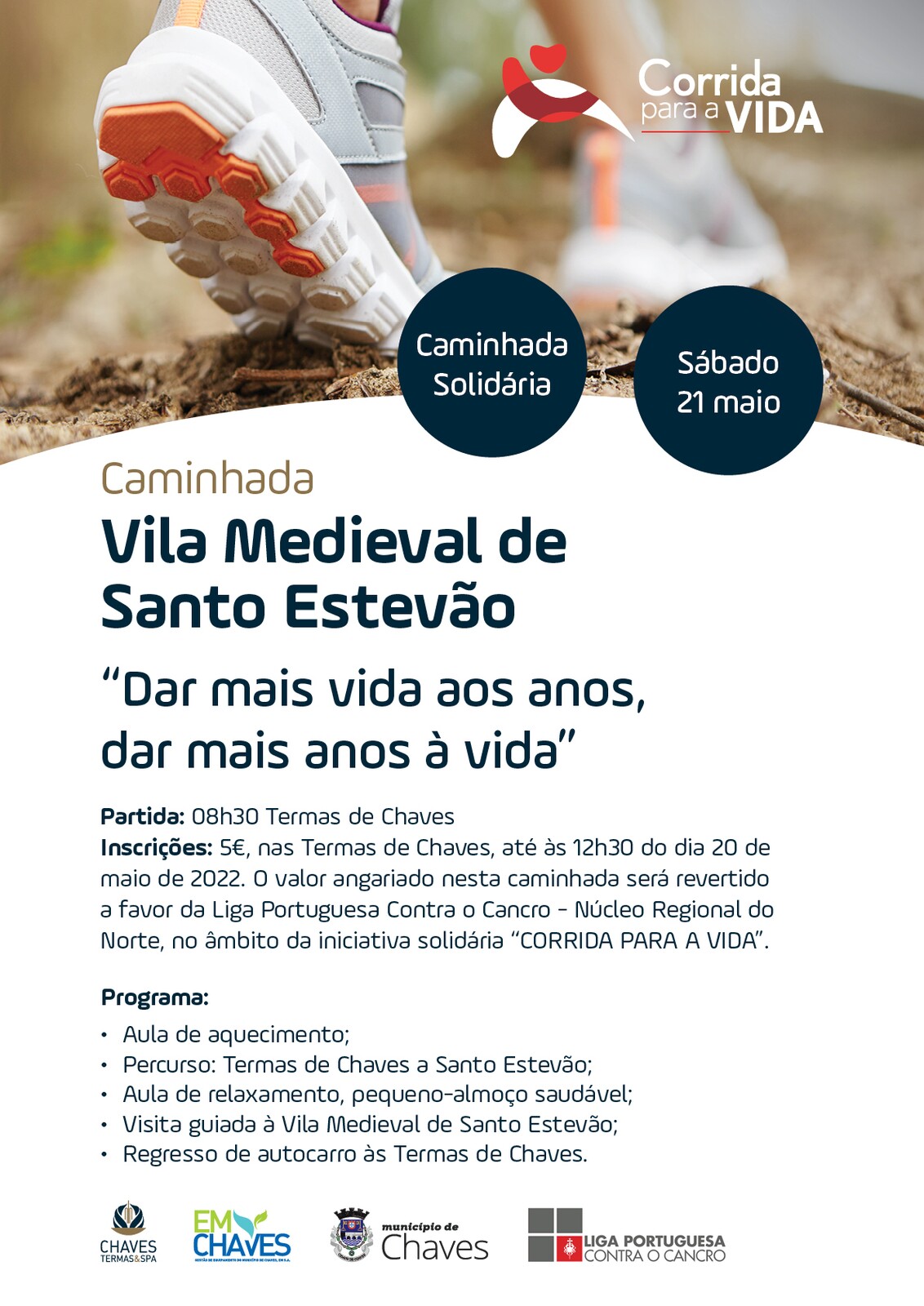 Os interessados deverão inscrever-se nas Termas de Chaves até às 12h30, do dia 20 de maio, com um custo de participação de 5 euros. O valor angariado nesta caminhada reverte a favor da Liga Portuguesa Contra o Cancro - Núcleo Regional do Norte, no âmbito da iniciativa solidária "Corrida para a Vida”.