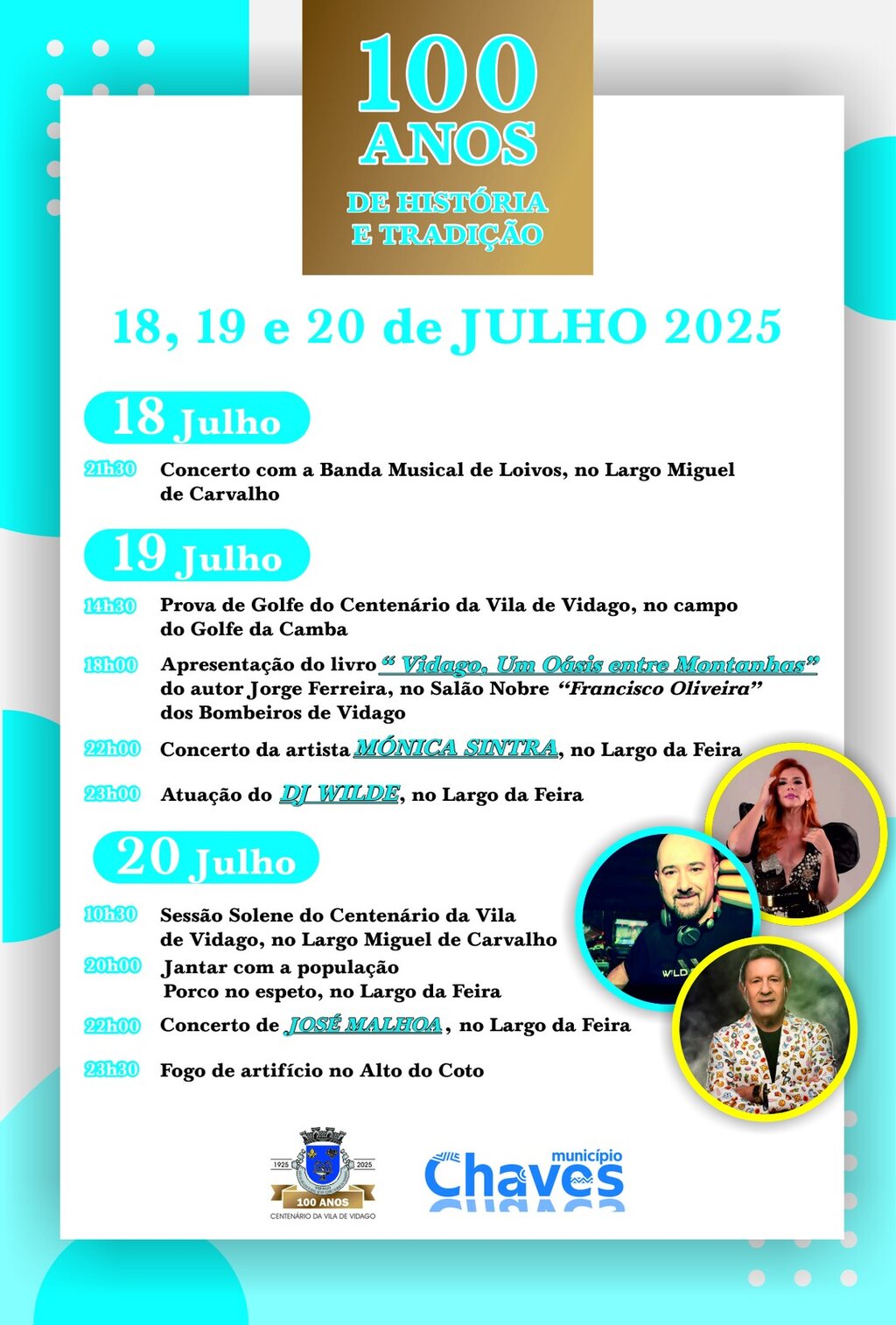 No dia 20 de julho terá lugar a celebração oficial do centenário da elevação a Vila e Sede de Freguesia. A manhã será marcada por uma sessão solene, às 10h30, no decorrer da qual o executivo da Freguesia de Vidago - União das Freguesias de Vidago, Arcossó, Selhariz e Vilarinho das Paranheiras - irá condecorar cidadãos e entidades que, ao longo do tempo, se distinguiram por méritos, feitos relevantes ou serviços prestados à comunidade vidaguense, numa demonstração pública de reconhecimento e gratidão.